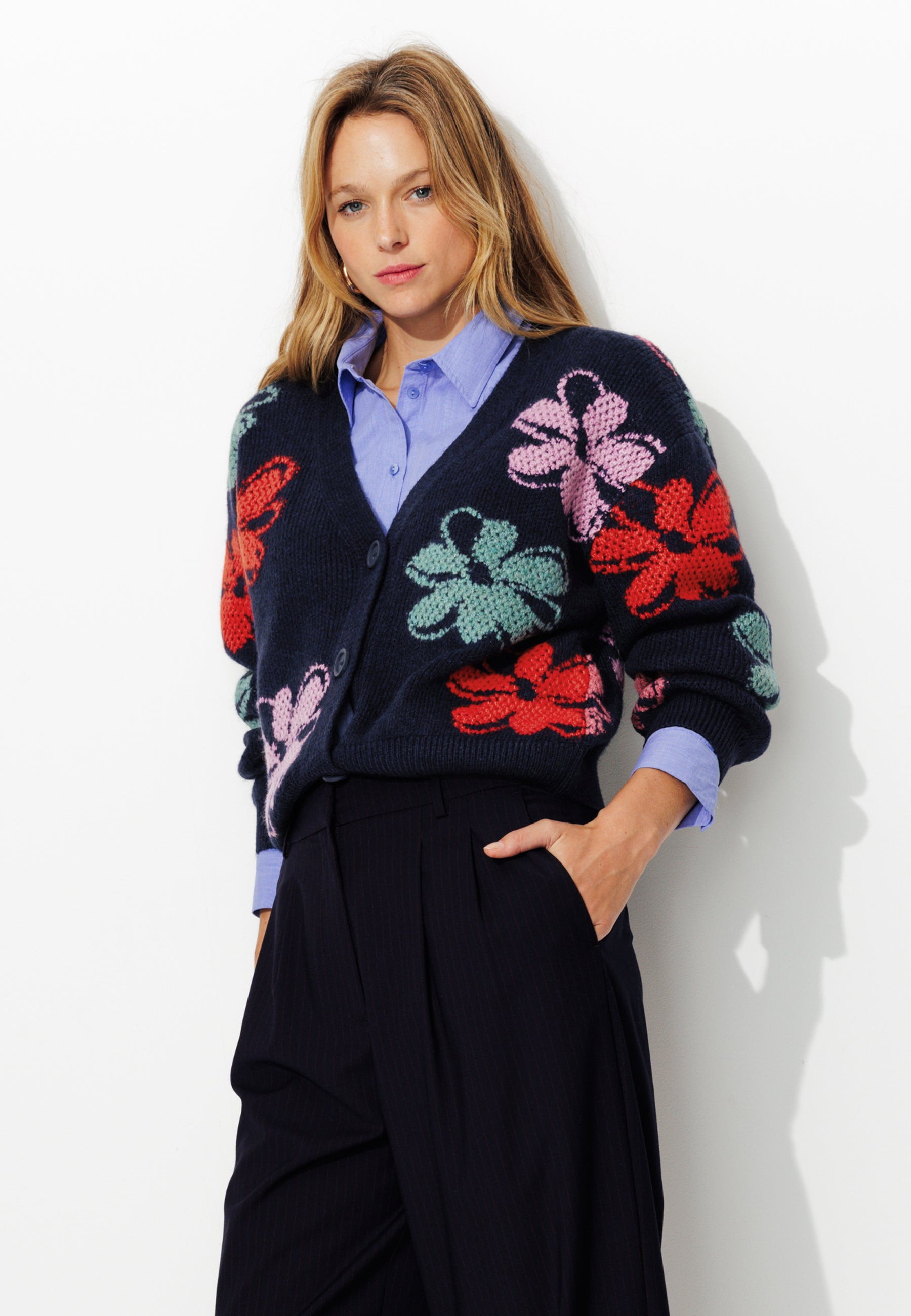 Cette saison, le cardigan oversize a la main verte et ses grandes fleurs colorent nos vies ! C'est toujours une bonne nouvelle, pour mettre de la bonne humeur dans les looks de l'automne-hiver. Avec un jean, un pantalon en velours, une jupe jupon... Maille épaisse. Couple ample resserrée à la base. Col V. Ouverture boutonnée. Emmanchures raglan. Manches longues coniques. Base droite. Bords-côtes.
