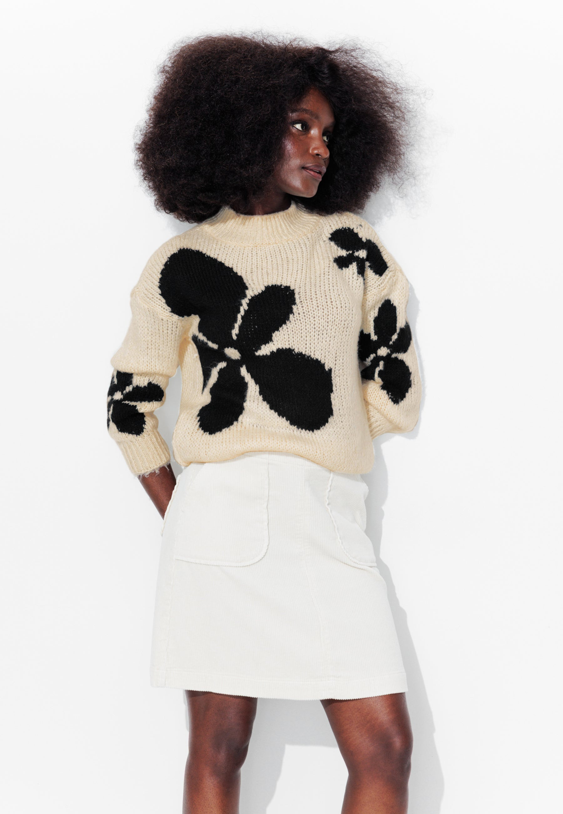 Maxi fleurs et grande douceur : on attend le froid avec impatience pour se lover dans ce pull à col montant. Joli avec une jupe, un jean, un pantalon en velours. La maille est souple, en points de jersey larges. Coupe légèrement resserrée à la base. Fleurs en jacquard devant, dos uni. Col rond montant côtelé. Emmanchures descendues. Manches longues. Base droite. Larges bords-côtes.