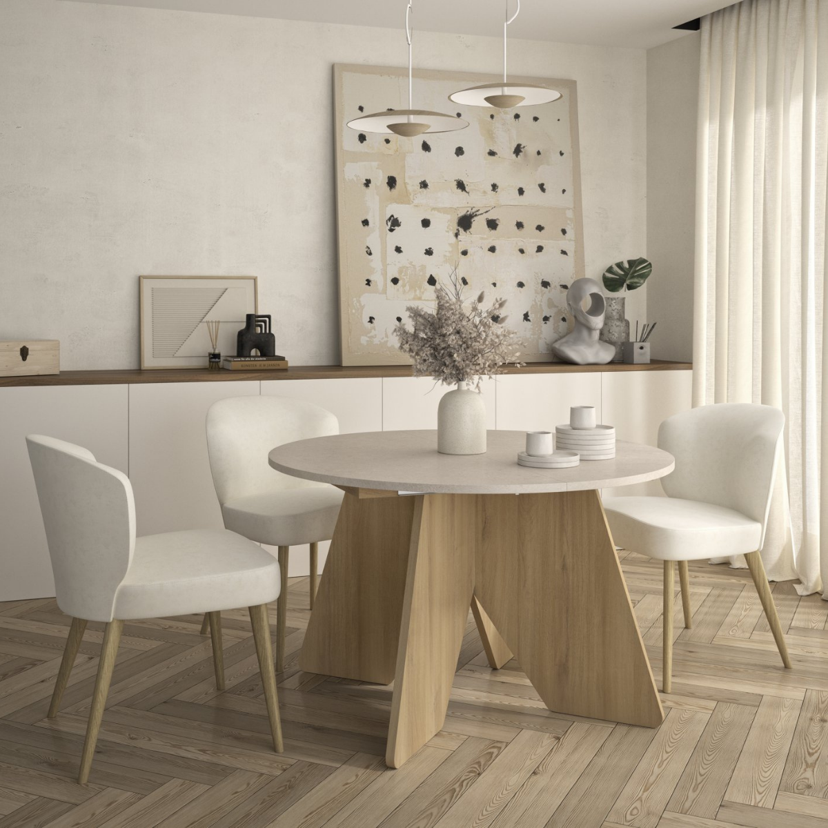- Table ronde avec plateaux et allonge en mélamine d'épaisseur 22 mm. Ce qui lui permet d'offrir une résistance parfaite au quotidien.