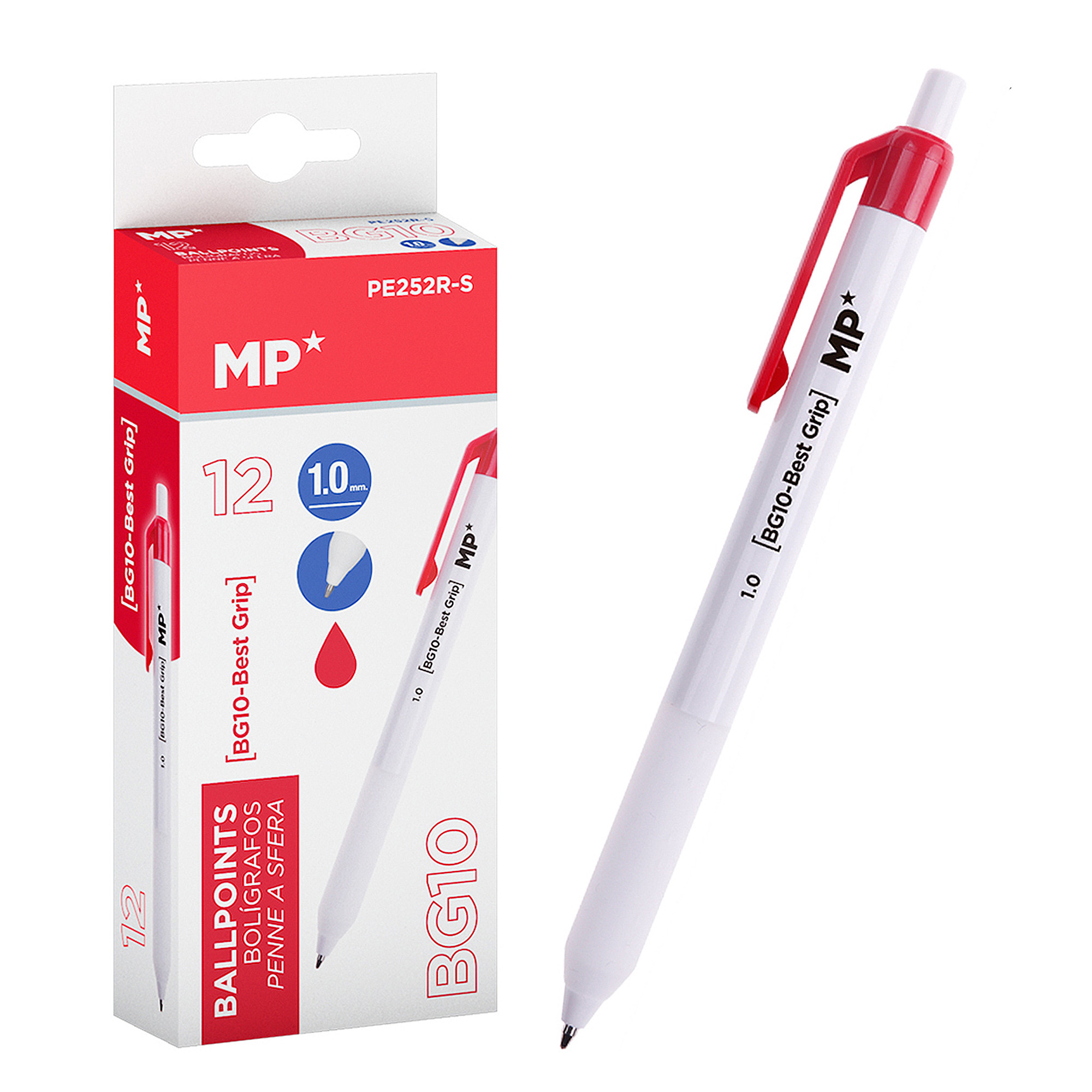 • Stylo à bille rétractable avec bouton poussoir au bout supérieur (système click). • Corps en plastique opaque blanc avec grip de maintien et encre à base d'huile en rouge. De plus, il possède un clip de maintien de la couleur de l'encre. • Pointe de 1.0 mm qui glisse sur le papier avec une totale fluidité. • Taille : 145 mm. Couleur de l'encre : rouge.