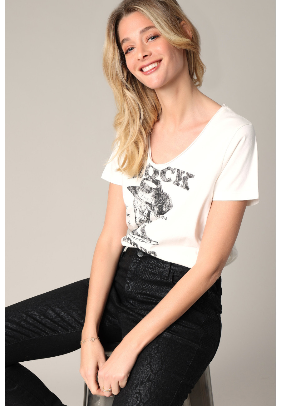 Le modèle RODEO à col en V incarne un look western moderne avec son imprimé audacieux représentant des bottes et un chapeau typiques du Far West. Conçu dans une coupe droite et fluide, il assure un confort optimal au fil de la journée. Sa matière douce et agréable en fait une pièce facile à associer à un jean ou à un short pour une allure décontractée mais stylée. Idéal pour insuffler un vent d’aventure dans vos tenues du quotidien.