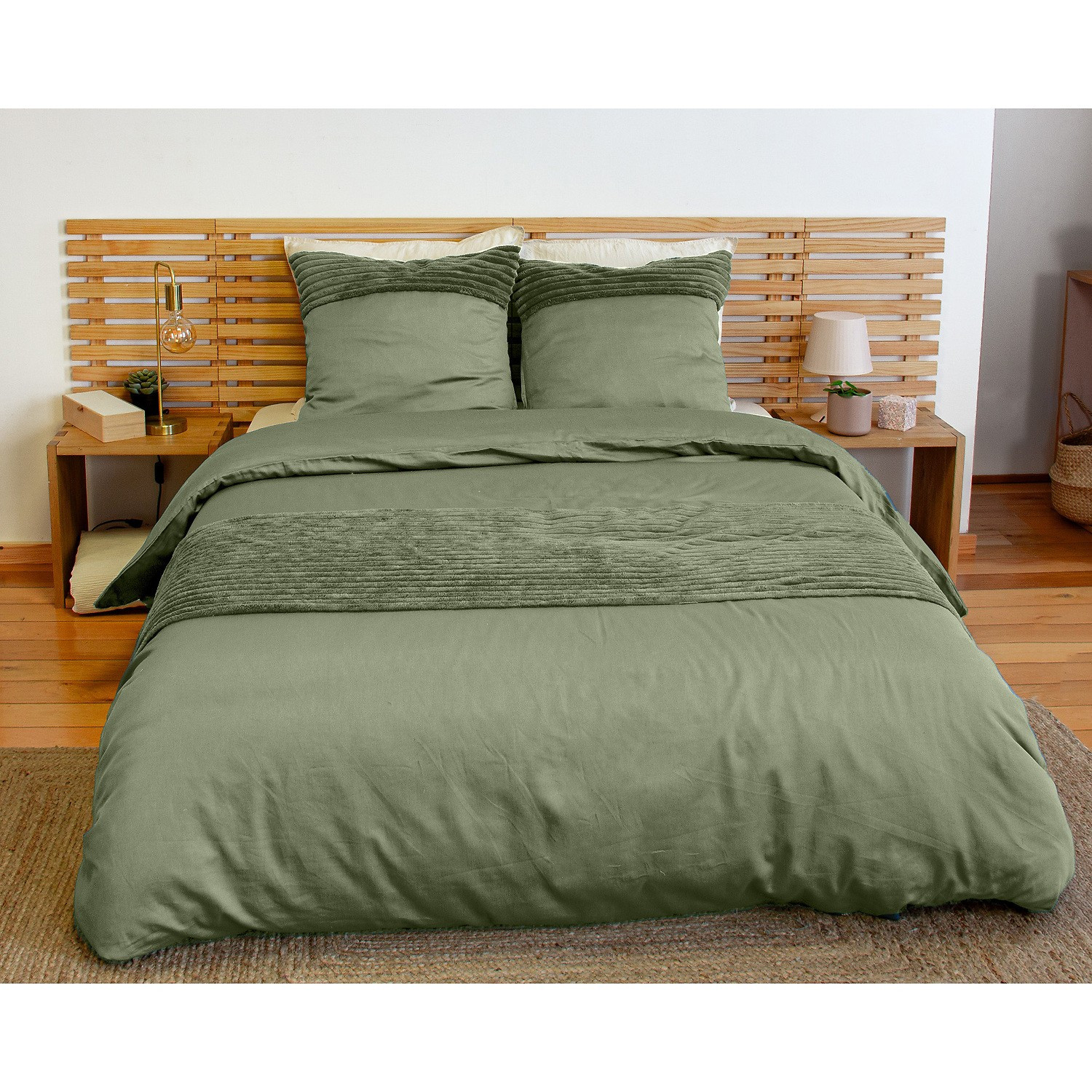 Information sur l'offre : PARURE HOUSSE DE COUETTE MICROFIBRE ET VELOUR COTELE Confort & Style au Quotidien Offrez une touche de modernité et de douceur à votre chambre avec notre parure de lit bitexture en 100% polyester, idéale pour allier confort, praticité et style. Caractéristiques : - Contenu de la parure : 1 housse de couette 240x220 + 2 taies d'oreiller - Composition : 100% polyester - Grammage : microfibre 90 g/m², velour côtelé 200 g/m² - Finition : boutons dissimulés Dimension : 140 x 200 cm + 1 taie d'oreiller (1 personne) 200 x 200 cm + 2 taies d'oreiller (1-2 personnes) 240 x 220 cm + 2 taies d'oreiller (2 personnes) 260 x 240 cm + 2 taies d'oreiller (2 personnes) Conseil d'entretien : Faites un prélavage avant utilisation - Respectez les instructions de lavage indiquées sur l'etiquette produit - Lavage à 30° ou à la main - Séchage à l'air - Repassage deconseillé. Les + produit : - Look premium : l'aspect texturé du velours côtelé donne un effet chic et cosy à votre intérieur. - Idéal pour un usage quotidien : résistante, facile d'entretien Disponible en plusieurs tailles et coloris pour s'adapter à tous les intérieurs.