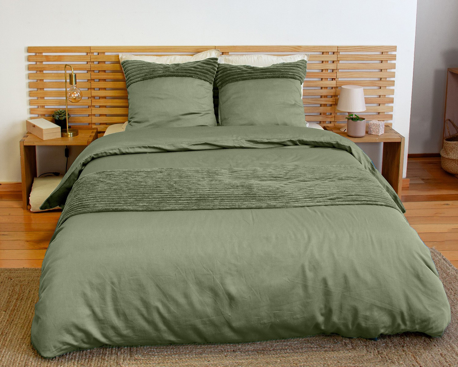 PARURE HOUSSE DE COUETTE MICROFIBRE ET VELOUR COTELE Confort & Style au Quotidien Offrez une touche de modernité et de douceur à votre chambre avec notre parure de lit bitexture en 100% polyester, idéale pour allier confort, praticité et style. Caractéristiques : - Contenu de la parure : 1 housse de couette 240x220 + 2 taies d'oreiller - Composition : 100% polyester - Grammage : microfibre 90 g/m², velour côtelé 200 g/m² - Finition : boutons dissimulés Dimension : 140 x 200 cm + 1 taie d'oreiller (1 personne) 200 x 200 cm + 2 taies d'oreiller (1-2 personnes) 240 x 220 cm + 2 taies d'oreiller (2 personnes) 260 x 240 cm + 2 taies d'oreiller (2 personnes) Conseil d'entretien : Faites un prélavage avant utilisation - Respectez les instructions de lavage indiquées sur l'etiquette produit - Lavage à 30° ou à la main - Séchage à l'air - Repassage deconseillé. Les + produit : - Look premium : l'aspect texturé du velours côtelé donne un effet chic et cosy à votre intérieur. - Idéal pour un usage quotidien : résistante, facile d'entretien Disponible en plusieurs tailles et coloris pour s'adapter à tous les intérieurs.