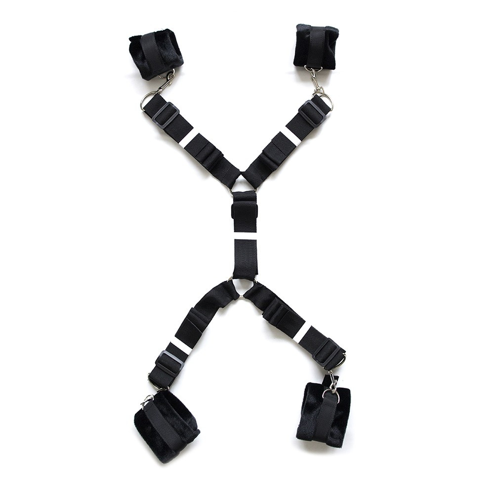 Menottes de lit pour chevilles et poignets ajustables par bandes scratch Soirée Sensations fortes, proposez à votre partenaire de l' attacher  sur le lit  pour vivre des expériences sensuelles et frissonnantes.  Ce kit est composé d'une sangle d'attache de lit, qui est fait de plusieurs sangles réglables. La sangle principale se positionne sous le lit. 2 paires de menottes pour chevilles et les poignets, réglables et à fermetures velcro viendront s'accrocher aux extrémités des sangles. La personne sera alors immobilisée  bras et jambes écartés. Matières : PP, polyester, ABS et Métal