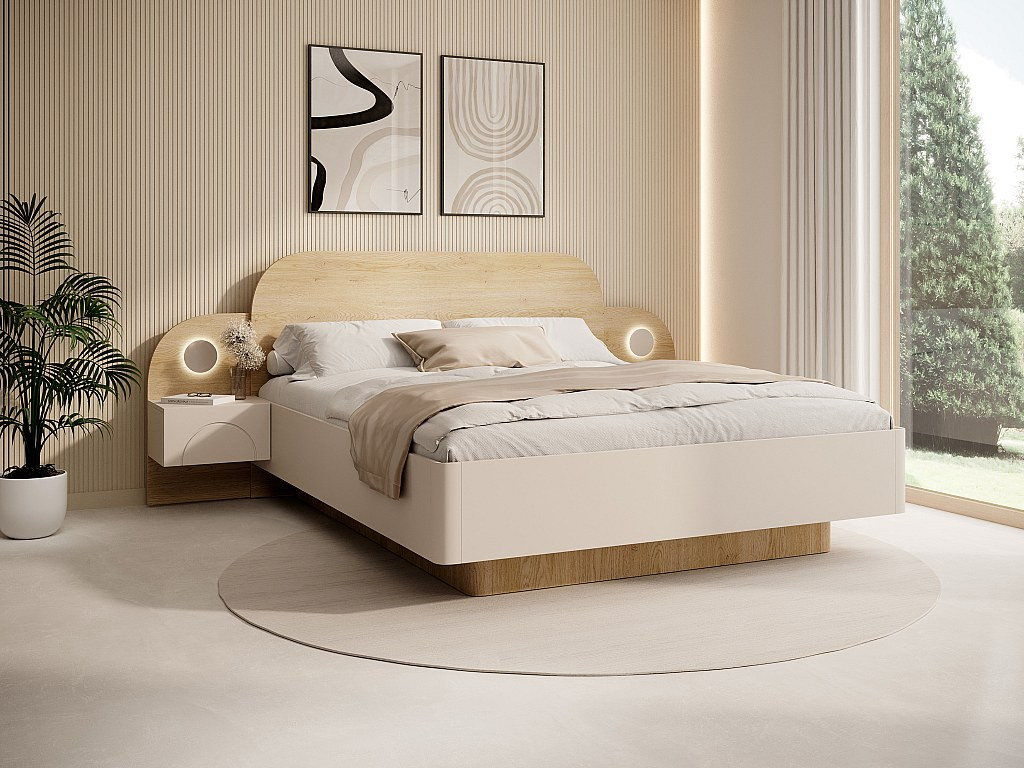 Information sur l'offre : Lit 160 x 200 cm avec chevets - Avec LEDs - Structure : Panneaux de particules - Beige et Naturel - Dims : L243,6 x P210 x H105,5 cm - Style : Design - DARTAGNO : quand le design moderne rencontre l’art du rangement