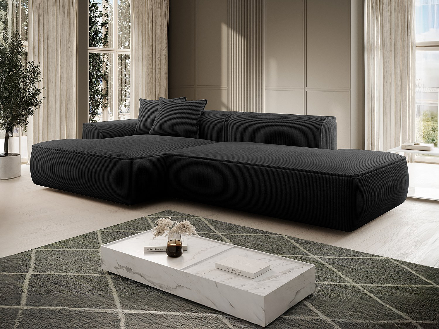 Information sur l'offre : Canapé d'angle gauche 5 places en velours côtelé noir. Coussins additionnels inclus. Douceur du velours côtelé. Fabriqué en Europe. Dimensions : L305 x P156 x H70 cm. ERYNEL