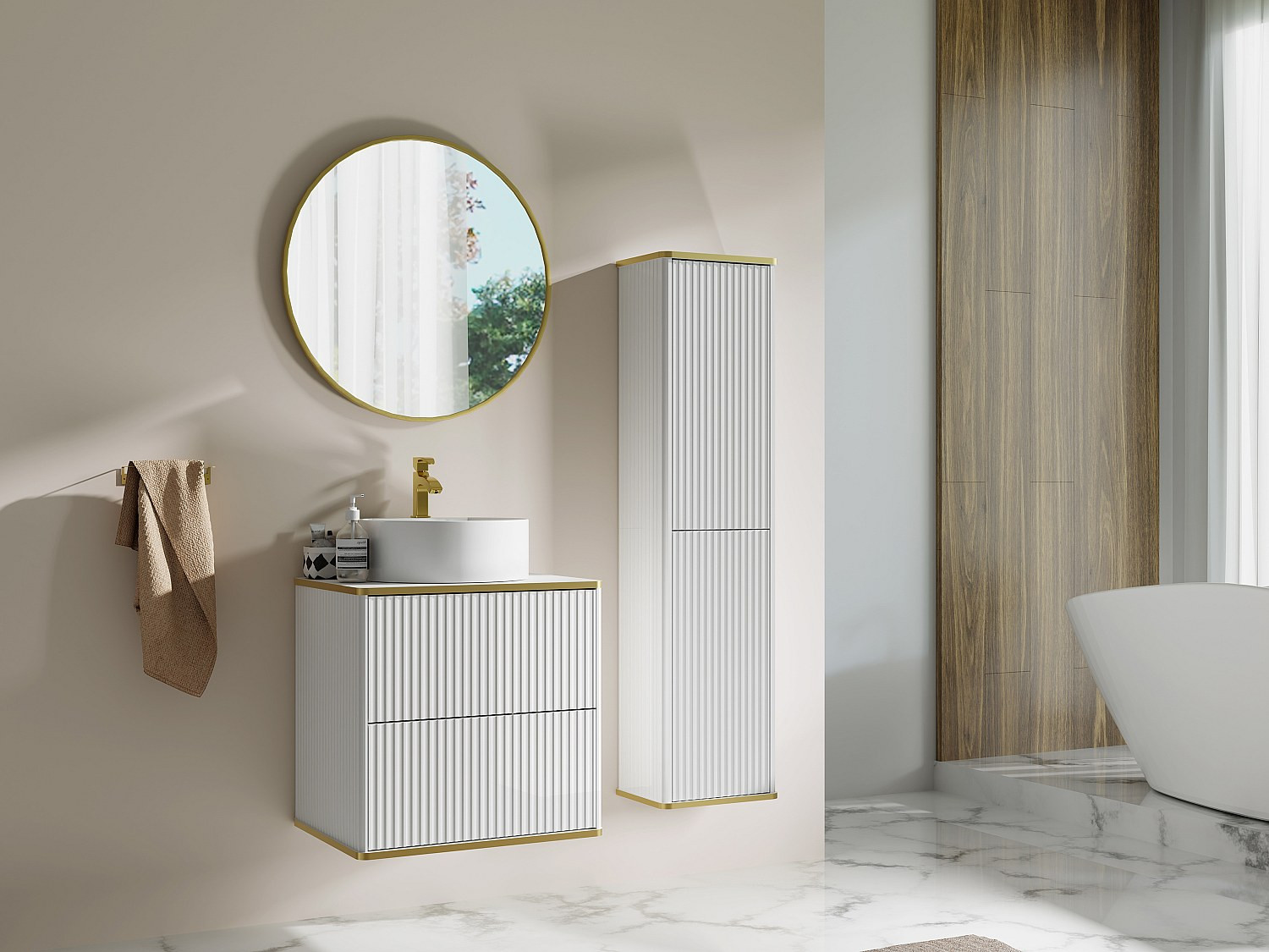 Vous souhaitez sublimer votre espace de bain ? Le meuble KELIZA répondra à vos désirs en associant esthétisme, raffinement et praticité avec son système d'ouverture push and pull et ses tiroirs spacieux. Il saura facilement se faire une place dans votre salle de bain. De plus, sa finition striée et sa touche dorée ajouteront une touche de luxe à votre espace de détente quotidien.