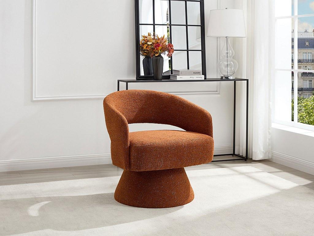 Information sur l'offre : Fauteuil pivotant en tissu chenille terracotta. Pied en forme de cône arrondi. Fonction pivotante pour plus de flexibilité. Douceur du tissu chenille. 1 place. Dimensions : L71 x P68 x H72 cm FEDOTE