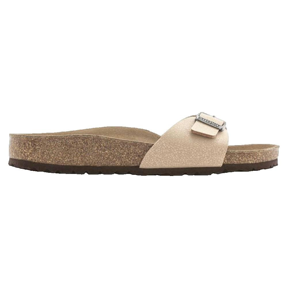 Le modèle Madrid vegan Etroite de la marque Birkenstock est une sandale unisexe pour adulte, conçue pour un usage lifestyle. Cette sandale fait partie de la catégorie des chaussures ouvertes, plus précisément des sandales, meduses et nu-pieds. Elle est fabriquée principalement en cuir, avec une tige en Birko-Flor®, une matière synthétique souple et résistante qui imite l'aspect du cuir nubuck. Ce modèle est végétalien, exempt de tout ingrédient d'origine animale, validé par des laboratoires indépendants. La sandale est de couleur orange et offre un design épuré et classique, très apprécié dans le monde de la mode.