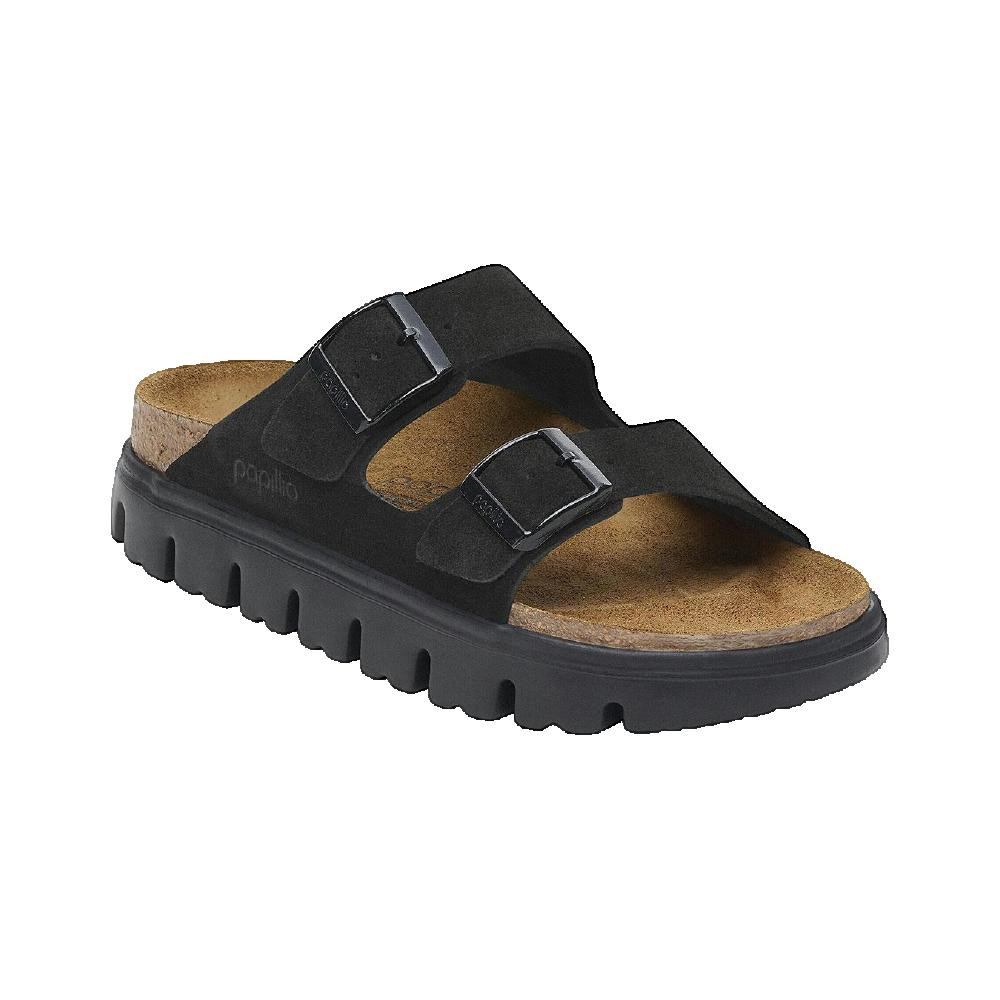 Claquettes Arizona à plateforme de la collection Automne-Hiver 2024 pour femme par Birkenstock. Ces claquettes ouvertes sont réalisées en cuir velours avec une semelle moulée confortable en liège. Elles présentent un bout ouvert arrondi et sont conçues pour un usage lifestyle. Couleur noire élégante, parfaites pour un style décontracté et tendance.