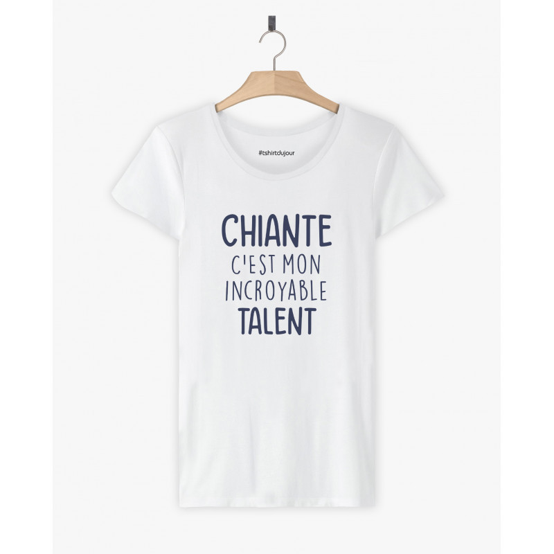 Information sur l'offre : T-shirt Femme - CHIANTE C'EST MON INCROYABLE TALENT - Si vous souhaitez laver votre tshirt chiante c'est mon incroyable talent en machine, nous vous recommandons de sélectionner une température de 30°c maximum, de retourner votre tshirt avant le lavage dans le but de préserver les couleurs du motif chiante c'est mon incroyable talent le plus longtemps possible et d'éviter d'utiliser un sèche linge qui a tendance à user prématurément nos produits. enfin, si vous souhaitez repasser votre tshirt nous vous recommandons de privillégier le repassage à l'envers.