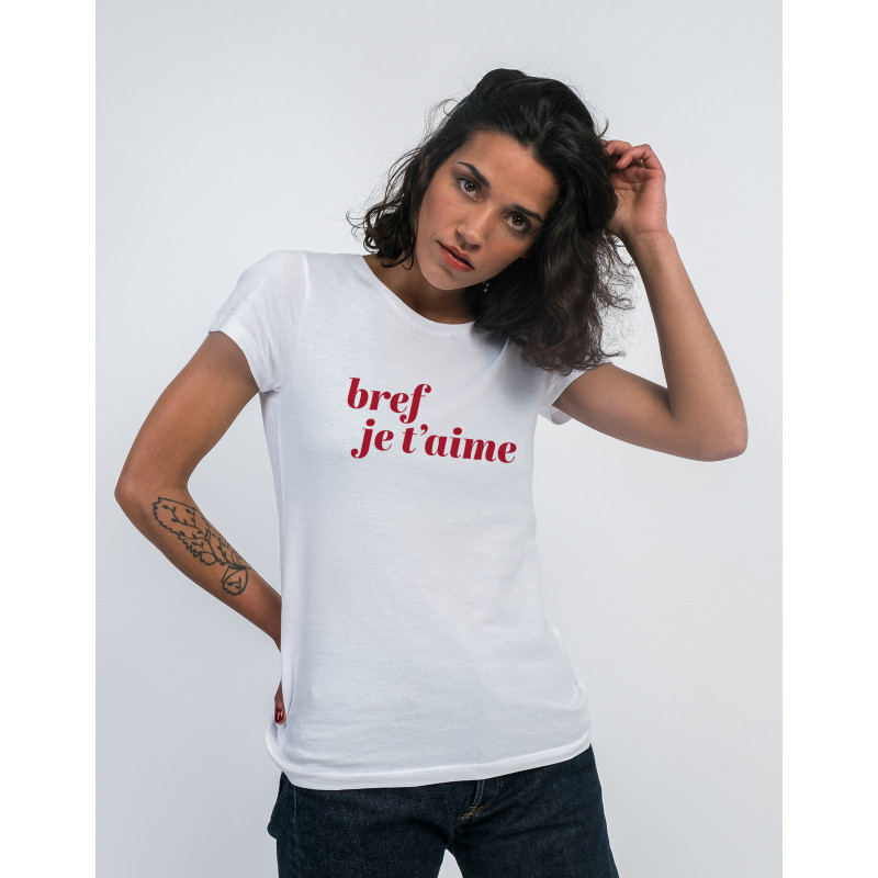 Tshirt Blanc de la marque Ma Petite Tribu. Un cadeau parfait pour Amour. Le motif Bref Je T'Aime Mpt est imprimé en France dans notre atelier à Toulouse sur un Tshirt de qualité très confortable 100% coton peigné issu de l'agriculture biologique enrichi d'un traitement d'enzyme pour un toucher tout doux. Certifié OCS (Organic Content Standard) et Oeko Tex Standard 100. T-shirt de qualité imprimé avec amour en France.