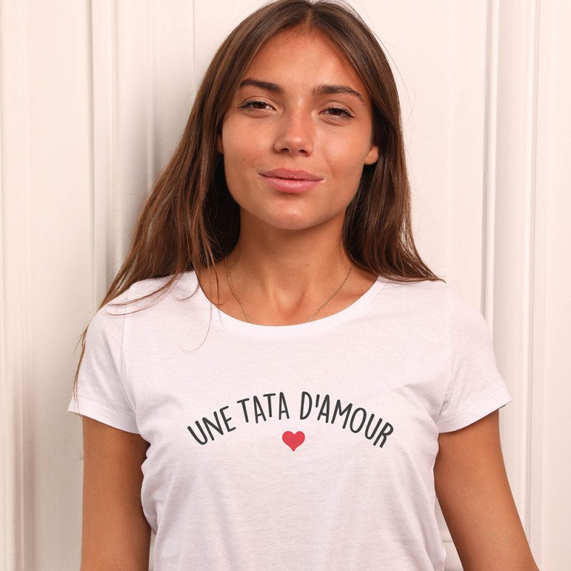 Tshirt Blanc de la marque Lovely Family. Un cadeau parfait pour Tata. Le motif Une Tata D'Amour est imprimé en France dans notre atelier à Toulouse sur un Tshirt de qualité très confortable 100% coton peigné issu de l'agriculture biologique enrichi d'un traitement d'enzyme pour un toucher tout doux. Certifié OCS (Organic Content Standard) et Oeko Tex Standard 100. T-shirt de qualité imprimé avec amour en France.