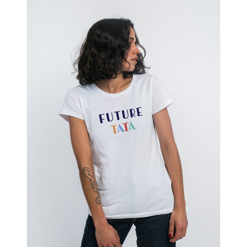 Tshirt Blanc de la marque We Are Family. Un cadeau parfait pour Tata. Le motif Future Tata est imprimé en France dans notre atelier à Toulouse sur un Tshirt de qualité très confortable 100% coton peigné issu de l'agriculture biologique enrichi d'un traitement d'enzyme pour un toucher tout doux. Certifié OCS (Organic Content Standard) et Oeko Tex Standard 100. T-shirt de qualité imprimé avec amour en France.