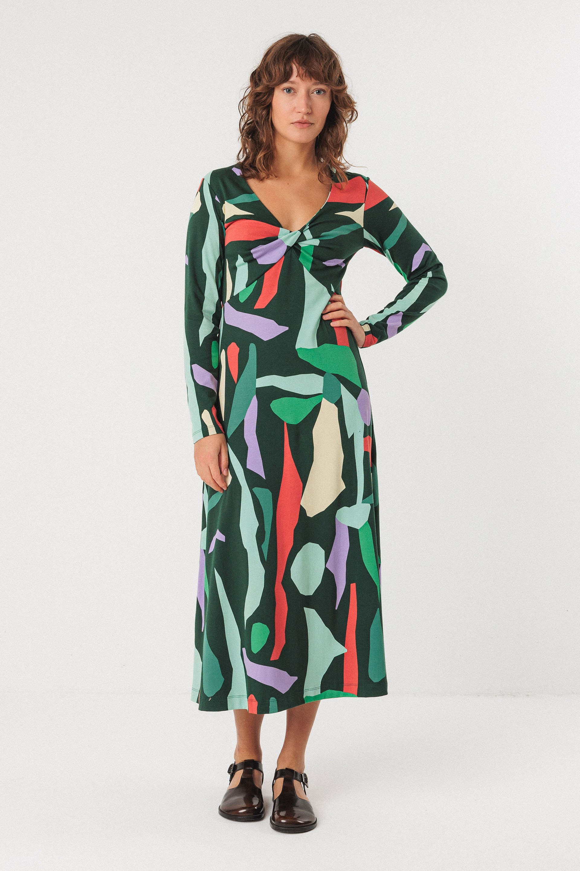Robe midi en coton biologique extensible à manches longues et col en V. 97 % coton biologique - 3 % élasthanne. Lavage à froid, cycle délicat. Ne pas repasser. Ne pas blanchir. Ne pas nettoyer à sec. Ne pas sécher en machine. Laver à l'envers. Laver avec des couleurs similaires.
