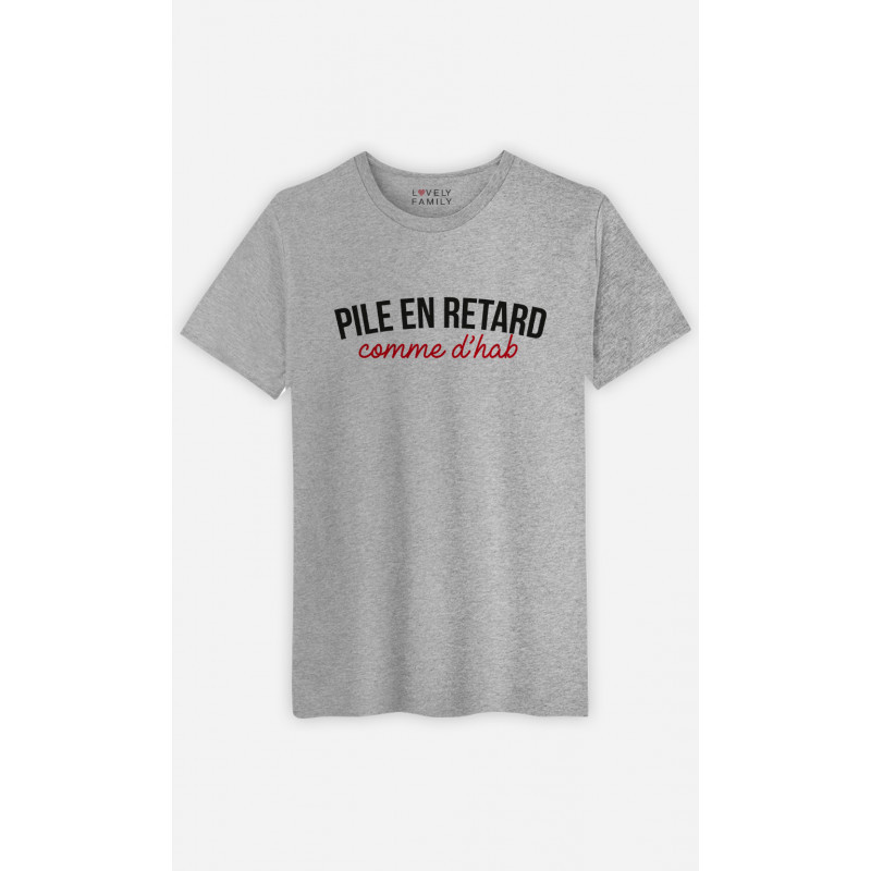 Tshirt Blanc de la marque Lovely Family. Un cadeau parfait pour Humour. Le motif Pile En Retard Comme D'Hab est imprimé en France dans notre atelier à Toulouse sur un Tshirt de qualité très confortable 100% coton peigné issu de l'agriculture biologique enrichi d'un traitement d'enzyme pour un toucher tout doux. Certifié OCS (Organic Content Standard) et Oeko Tex Standard 100. T-shirt de qualité imprimé avec amour en France.