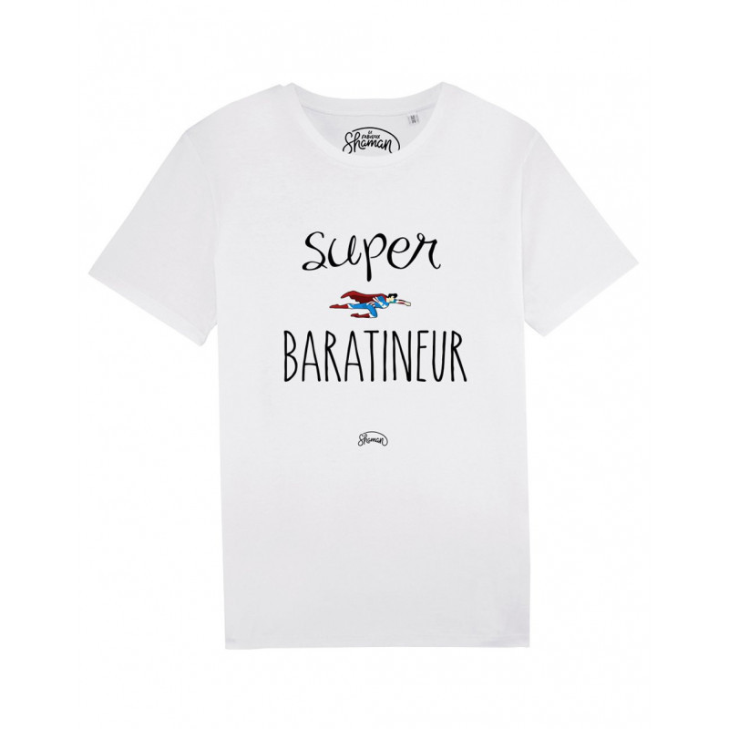 Tshirt Blanc de la marque Shaman. Un cadeau parfait pour . Le motif Super Baratineur est imprimé en France dans notre atelier à Toulouse sur un Tshirt de qualité très confortable 100% coton peigné issu de l'agriculture biologique enrichi d'un traitement d'enzyme pour un toucher tout doux. Certifié OCS (Organic Content Standard) et Oeko Tex Standard 100. T-shirt de qualité imprimé avec amour en France.