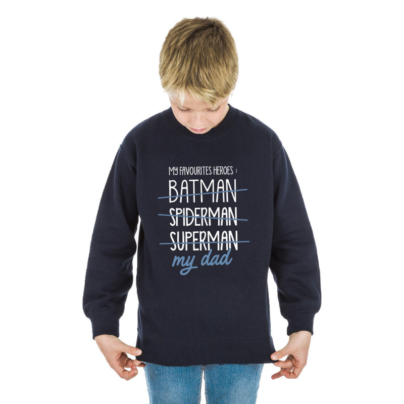 SWEAT NAVY de la marque We Are Family. Un cadeau parfait pour Mes enfants. Le motif MY FAVOURITES HEROES : BATMAN SPIDERMAN SUPERMAN MY DAD 2WAF est imprimé en France dans notre atelier à Toulouse sur un SWEAT de qualité très confortable 50% coton-50% polyester Molleton gratté à l'intérieur