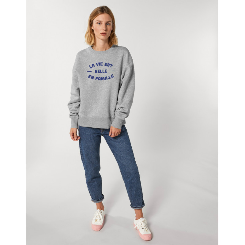Information sur l'offre : Sweat Vintage White de la marque Ma Petite Tribu. Un cadeau parfait pour . Le motif La Vie Est Belle En Famille 2 Face est imprimé en France dans notre atelier à Toulouse sur un Sweat de qualité très confortable 85% coton bio - 280g/m² - Manches montées Bord en côtes 1x1 sur col, bas de manches et bas de corps Bande de propreté intérieur col en chevron Surpiqûre flatlock sur toutes les coutures Demi-lune à l'intérieur du col dans la matière principale