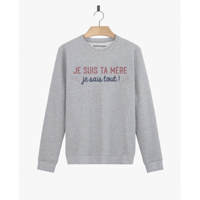 Sweat Femme - JE SUIS TA MÈRE JE SAIS TOUT - Si vous souhaitez laver votre sweat je suis ta mère je sais tout en machine, nous vous recommandons de sélectionner une température de 30°c maximum, de retourner votre sweat avant le lavage dans le but de préserver les couleurs du motif je suis ta mère je sais tout le plus longtemps possible et d'éviter d'utiliser un sèche linge qui a tendance à user prématurément nos produits. enfin, si vous souhaitez repasser votre sweat nous vous recommandons de privillégier le repassage à l'envers.