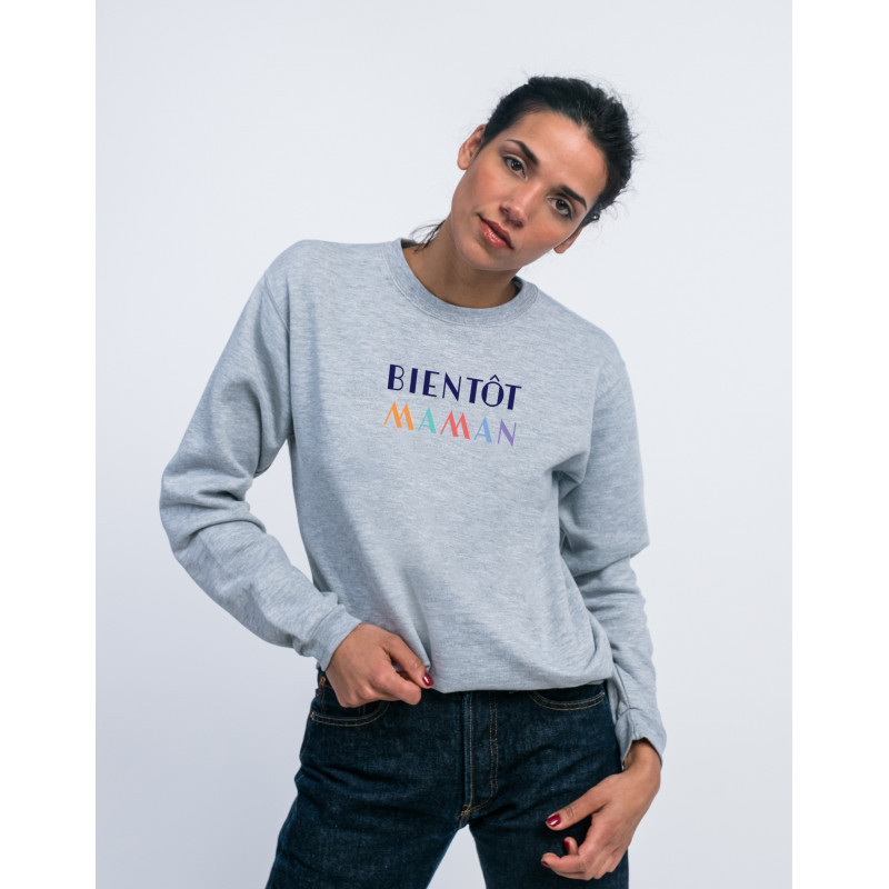 Sweat Gris Chiné de la marque We Are Family. Un cadeau parfait pour Maman. Le motif Bientôt Maman est imprimé en France dans notre atelier à Toulouse sur un Sweat de qualité très confortable 50% coton-50% polyester Molleton brossé à l'intérieur. Sweatshirt imprimé avec amour en France.