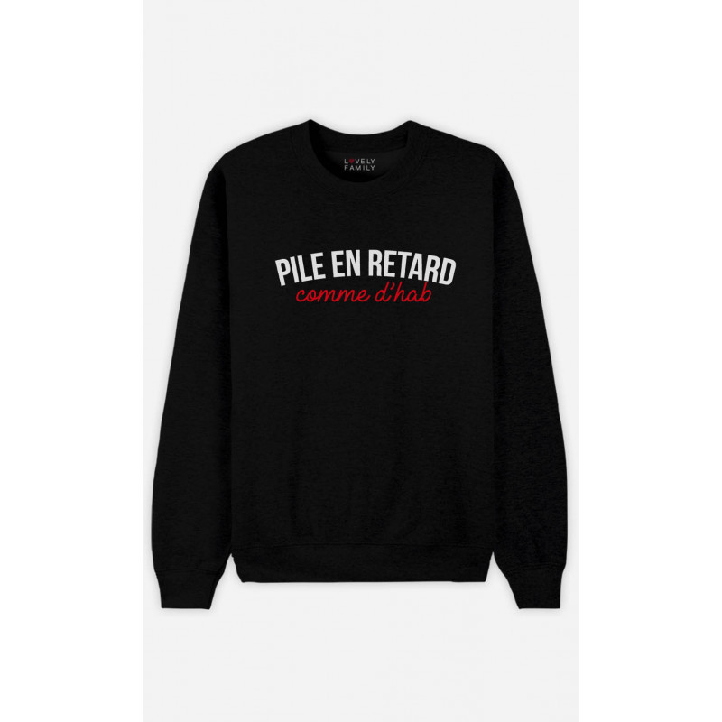 Sweat Gris Chiné de la marque Lovely Family. Un cadeau parfait pour Humour. Le motif Pile En Retard Comme D'Hab est imprimé en France dans notre atelier à Toulouse sur un Sweat de qualité très confortable 50% coton-50% polyester Molleton brossé à l'intérieur. Sweatshirt imprimé avec amour en France.