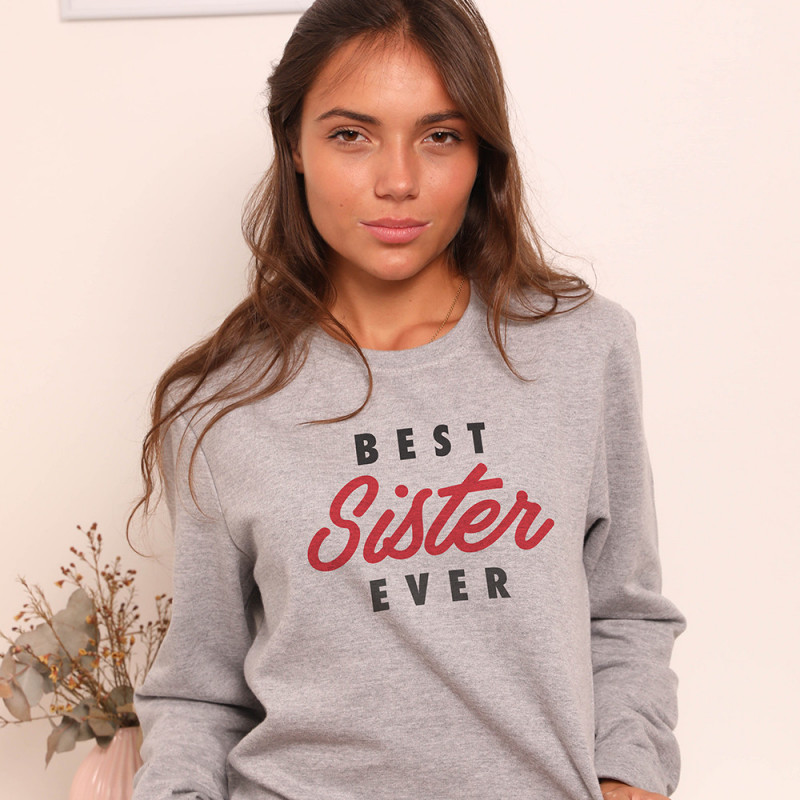 Sweat Gris Chiné de la marque Lovely Family. Un cadeau parfait pour Ma Sœur. Le motif Best Sister Ever est imprimé en France dans notre atelier à Toulouse sur un Sweat de qualité très confortable 50% coton-50% polyester Molleton brossé à l'intérieur. Sweatshirt imprimé avec amour en France.