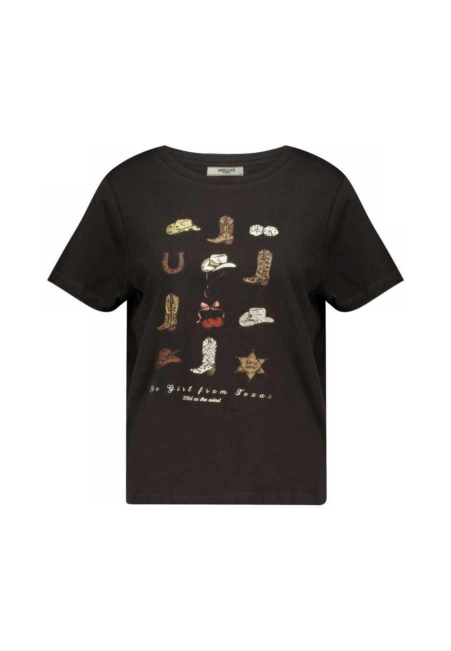 Le t-shirt TEXAS à manches courtes s'inspire de l’univers western avec un imprimé ludique mêlant bottes, chapeaux et symboles typiques du Far West. En 100% coton, Sa coupe droite et fluide assure un tombé naturel, tandis que l'encolure ronde et les finitions sobres renforcent son esprit casual. Un modèle à l’allure originale pour affirmer son style avec décontraction.