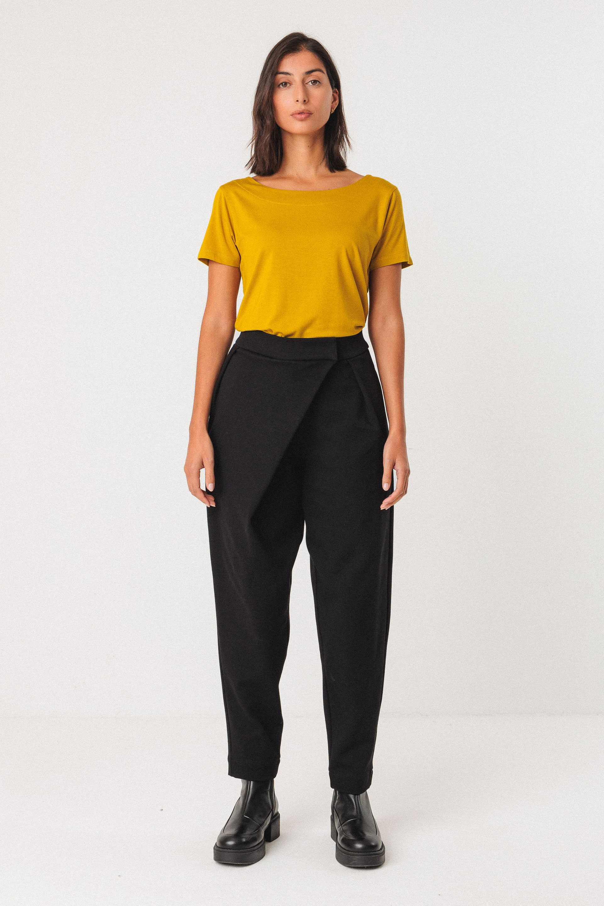 Pantalon longueur cheville avec un large pli sur le devant. Fermeture éclair et bouton sur le devant, poches latérales dans les coutures et fausses poches arrière. 75 % Lenzing™ ecovero™ - 21 % nylon recyclé - 4 % élasthanne. Lavage à froid, cycle délicat. Ne pas repasser. Ne pas blanchir. Ne pas nettoyer à sec. Ne pas sécher en machine. Laver à l'envers. Laver avec des couleurs similaires.