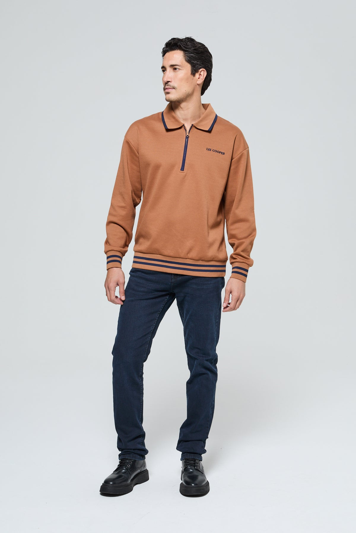 Le zip sur le col, associé aux coudières contrastées et au biais de couleur sur le col, les poignets et le bas du sweat, apportent une touche dynamique et originale. Sa coupe comfort et son design inspiré du polo assure une silhouette décontractée, tout en restant chic et raffinée.