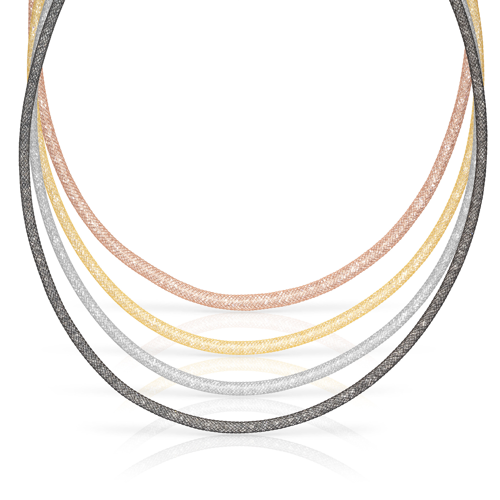 • Ensemble de quatre colliers avec un élégant design en maille de cuivre en noir, argent, or et rose, apportant polyvalence et style. • Chaque collier incorpore un remplissage en cristal brillant qui rehausse sa luminosité et son attrait visuel. • Fermetures en mousqueton permettant de mettre et d'enlever les colliers confortablement et en toute sécurité. • Parfaits pour se combiner entre eux ou à porter séparément, idéaux pour des occasions spéciales ou comme cadeau, alliant éclat, couleur et sophistication.