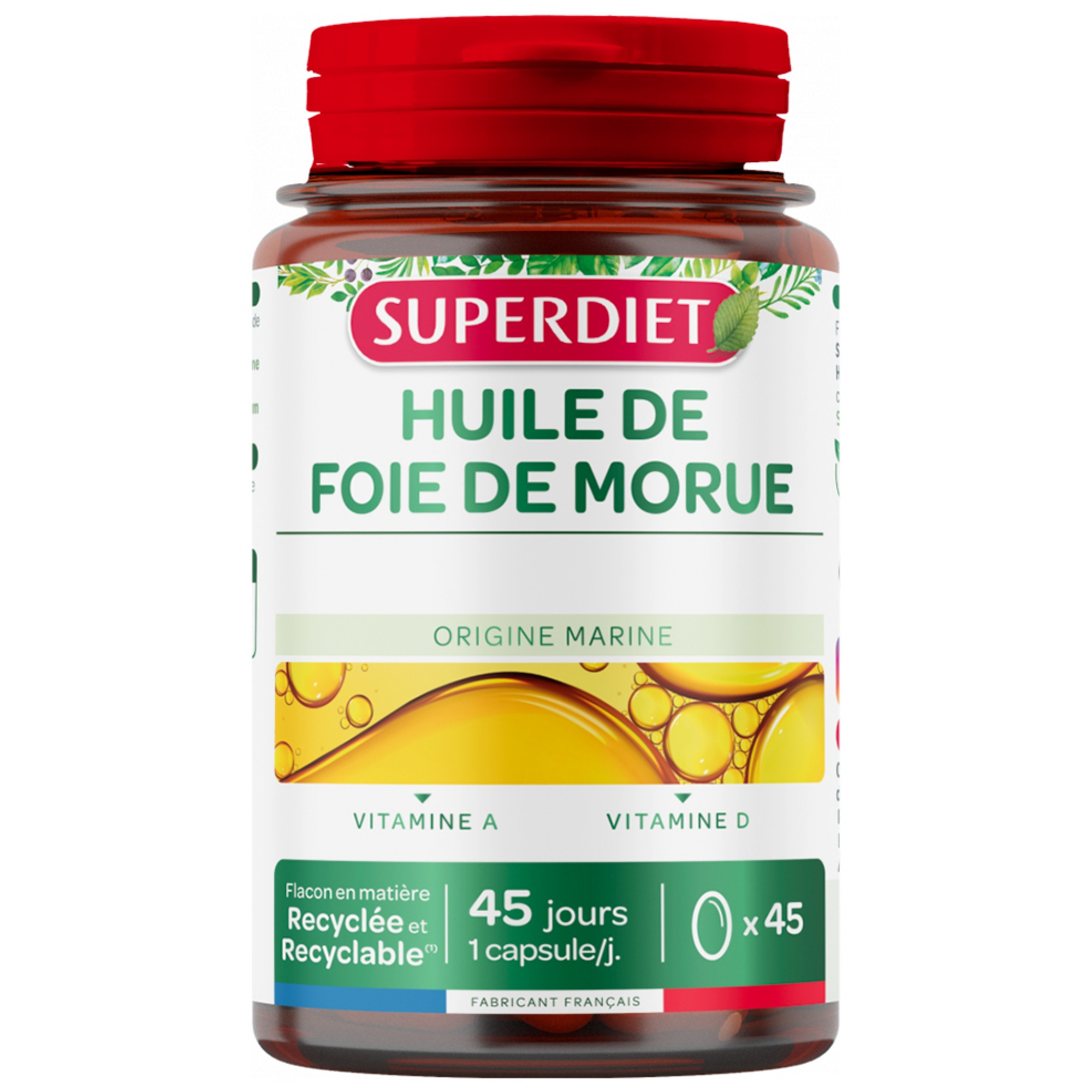 Superdiet Huile de Foie de Morue 45 Unités est un complément riche en vitamine A et D, favorisant le bon fonctionnement du système immunitaire et le maintien d'une vision normale La vitamine A et D contribuent non seulement au bon fonctionnement du système immunitaire, mais également à l'utilisation et à l'absorption normale du calcium De plus, elles participent au maintien d'une ossature et d'une dentition normalesGrâce à sa concentration en nutriments bénéfiques, il constitue un soutien précieux pour renforcer votre immunité et maintenir une vision optimale