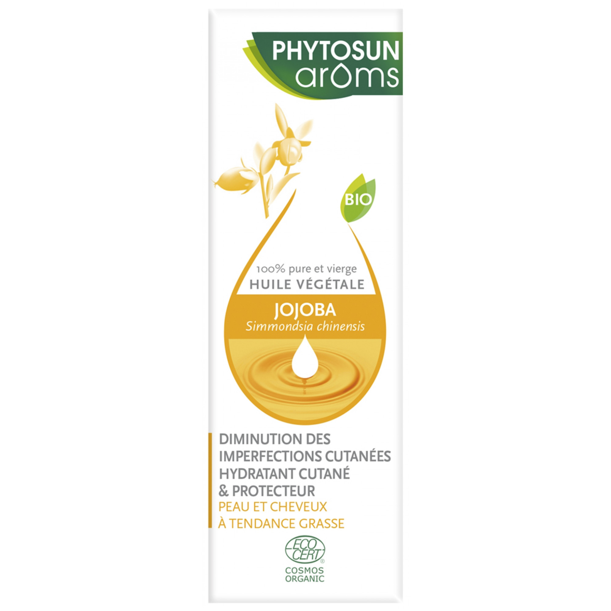 Phytosun Arôms Huile Végétale Jojoba Bio 50 ML est une huile végétale de Jojoba 100% pure et vierge, extraite de façon naturelle par pression à froid. Elle n'a subi aucun raffinage afin de préserver l'intégrité de ses constituants, de sa synergie et de son effet bénéfique Elle réduit les imperfections cutanées des peaux grassesElle hydrate les couches supérieures de l'épidermeElle protège les peaux et les cheveux à tendance grasseLa texture est fluide et douce, tandis que son absorption est rapide Elle contient Des acides gras monoinsaturés : acide gadoléique (61-75,5%)Du Docosénol (39,5%-61%)De l'Eicosénol (34%-56%)100% du total des ingrédients sont issus de l'Agriculture Biologique100% du total des ingrédients est d'origine naturelleCosmos Organic Certifié par Ecocert Greenlife selon le référentiel Cosmos Testé sous contrôle dermatologique