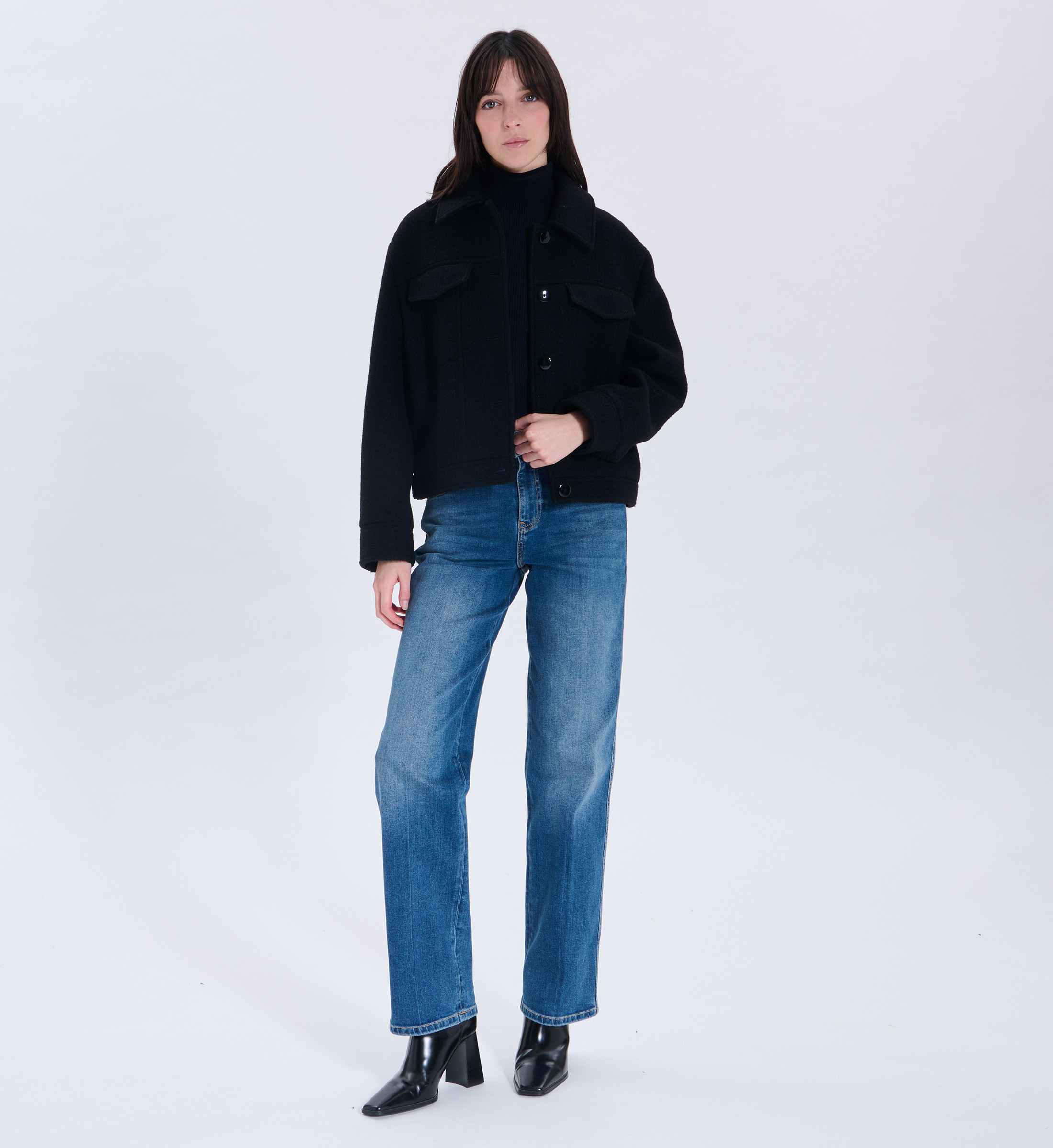 Le manteau MINO revisite la surchemise avec modernité. Sa coupe courte et oversize s’associe à une laine bouillie pour un style casual et tendance. Idéal pour un look urbain structuré. Manteau court Coupe ample façon surchemise Col chemise Fermeture boutonnée 2 poches poitrine à rabat Coloris noir