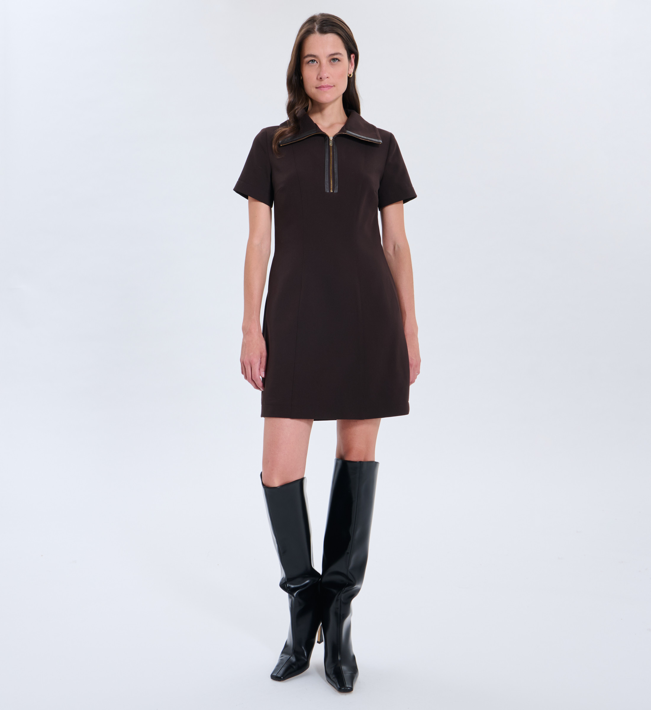 Chic et féminine, la robe RINDA séduit par sa coupe évasée et ses manches légèrement bouffantes. Son tissu fluide et texturé offre un tombé parfait pour les silhouettes en mouvement. Disponible en chocolat, elle se porte aussi bien en journée qu’en soirée. Robe courte Coupe légèrement trapèze Encolure ronde Manches longues bouffantes Fermeture zippée au dos Coloris chocolat