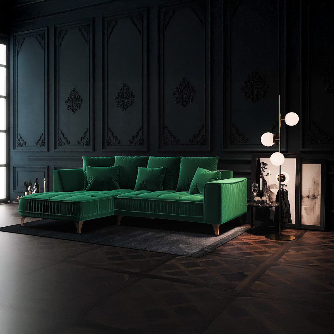 Chloé, petit canapé méridienne gauche vert foncé