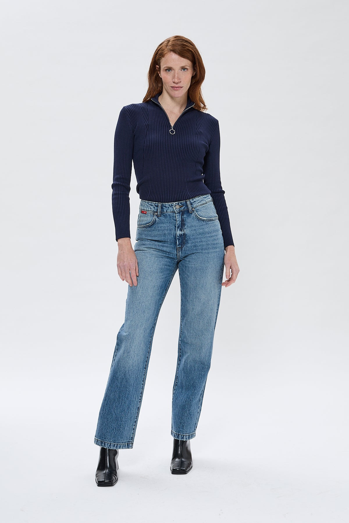 Jean coupe regular en 100% Coton avec jambe droite et ample, pour une silhouette fluide et décontractée, doté de poches latérales discrètes. Longueur 32