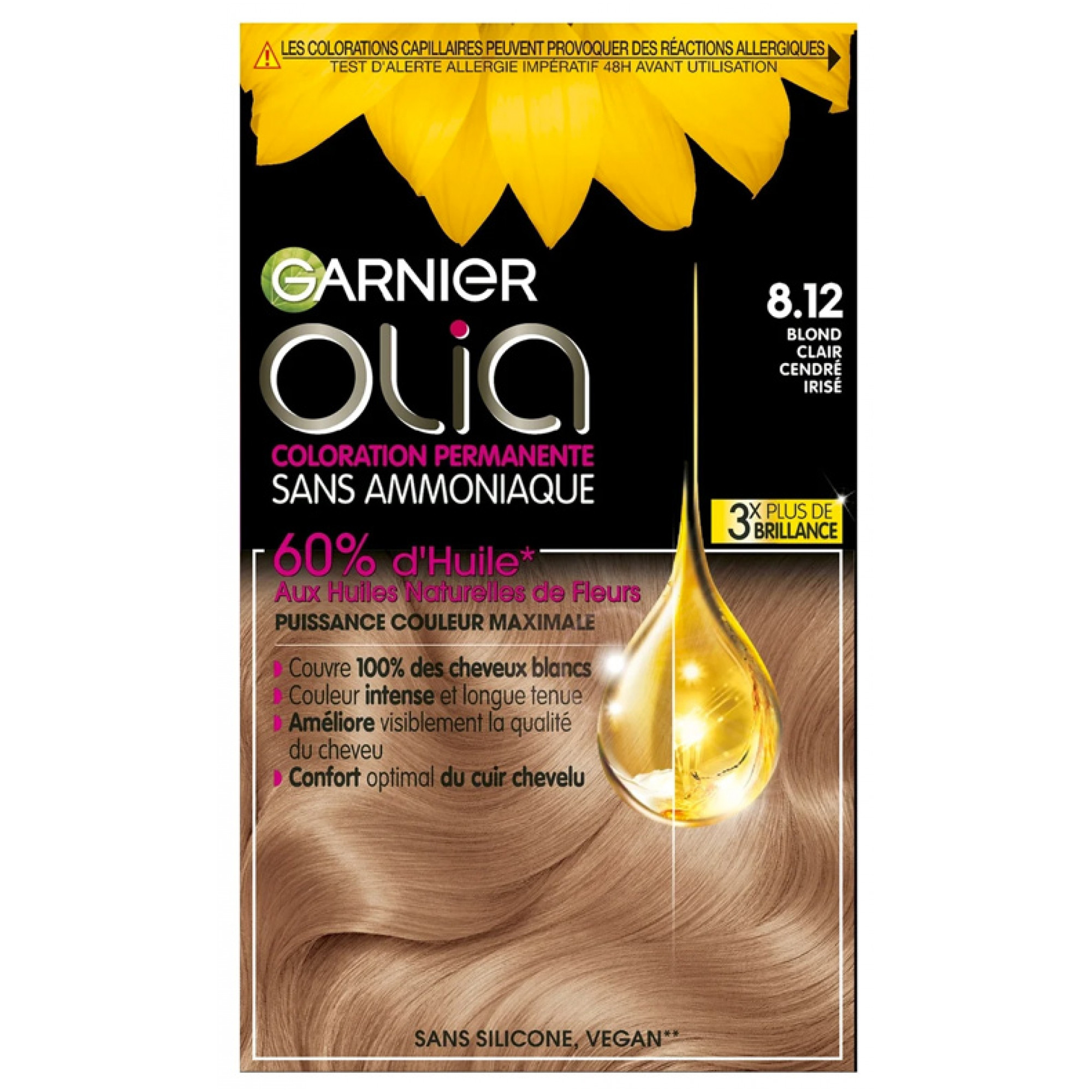 Garnier Olia Coloration Permanente Sans Ammoniaque Sans Silicone 120 g est un véritable soin pour les cheveux qui allie performance colorante et respect du cheveu Enrichie avec 60% d'huile, cette coloration améliore visiblement la qualité des cheveux, les laissant plus doux et plus brillants coloration après colorationCette coloration garantit une couleur longue tenue, riche et éclatante, tout en préservant la santé de vos cheveuxSa formule ne coule pas et laisse un délicat parfum floral Sans amoniaque, sans silicone Vegan Ce kit contient : 1 flacon applicateur de crème révélatrice 60 g1 tube de crème colorante 60 g1 tube de crème de soin sans silicone réutilisable 54 ml1 paire de gants1 notice