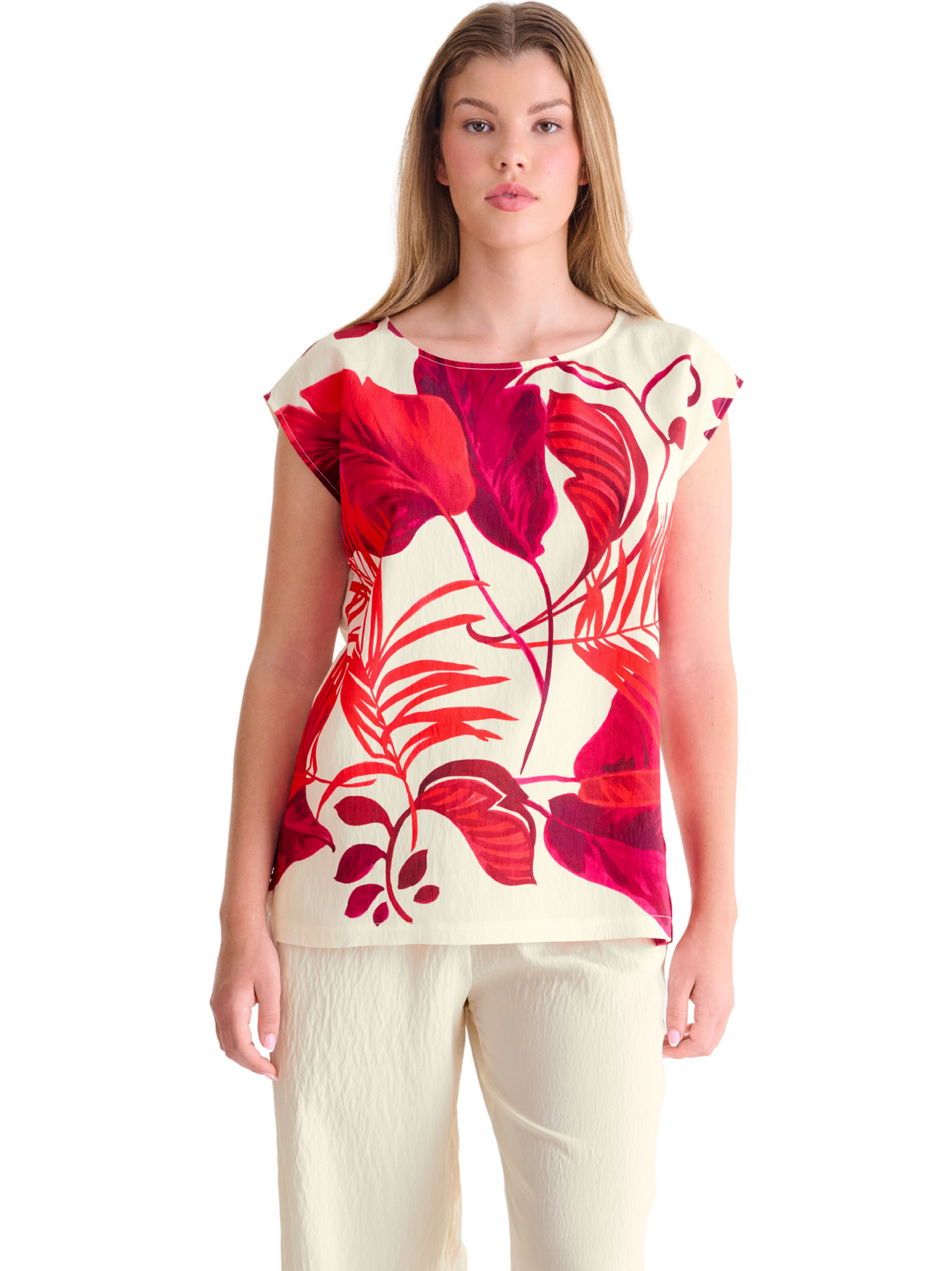 Ce top féminin et estival se distingue par sa coupe droite et fluide, offrant une silhouette à la fois élégante et décontractée. Il est confectionné dans un tissu viscose léger de couleur écrue, au toucher légèrement texturé, qui met parfaitement en valeur le grand imprimé botanique qui le recouvre. Le motif, très expressif, évoque une végétation tropicale luxuriante : de grandes feuilles et fleurs stylisées s’entrelacent dans une palette vibrante. Ces nuances contrastent magnifiquement avec le fond clair, apportant énergie et caractère à la pièce. Le col rond, simple et dégagé, souligne la ligne du cou tandis que les manches courtes et légèrement tombantes ajoutent une touche de douceur et de féminité. La longueur du top qui s’arrête juste sur les hanches, environ 65 cm, en fait un vêtement facile à porter aussi bien rentré dans un pantalon ou une jupe que laissé libre pour un style plus naturel. C’est un haut à l’allure fraîche et solaire, parfait pour les journées d’été ou pour apporter une note colorée à une tenue plus sobre.