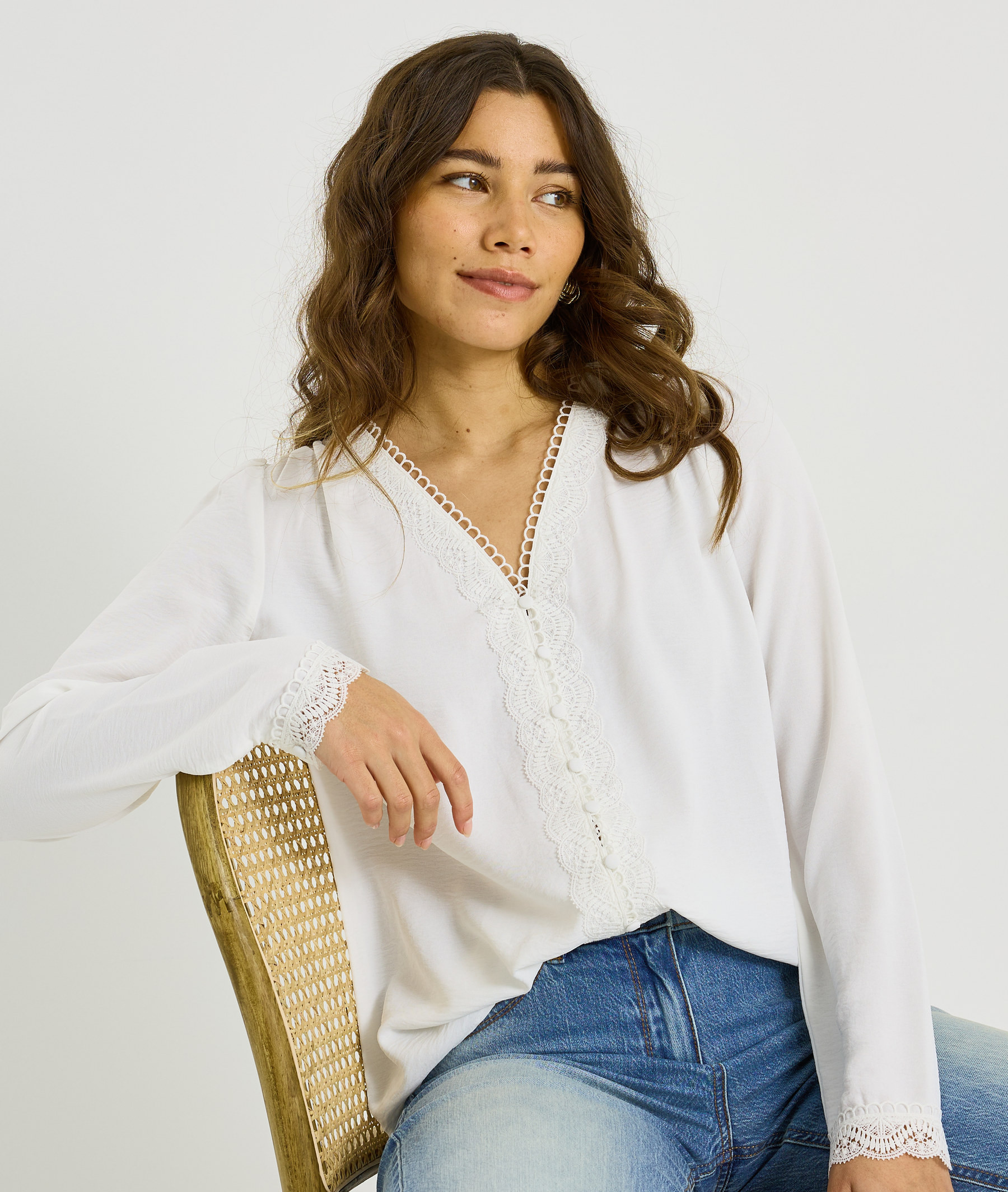 Cette blouse unie se distingue par ses détails ajourés qui apportent finesse et légèreté. Sa coupe fluide en fait un modèle idéal pour composer des tenues élégantes.