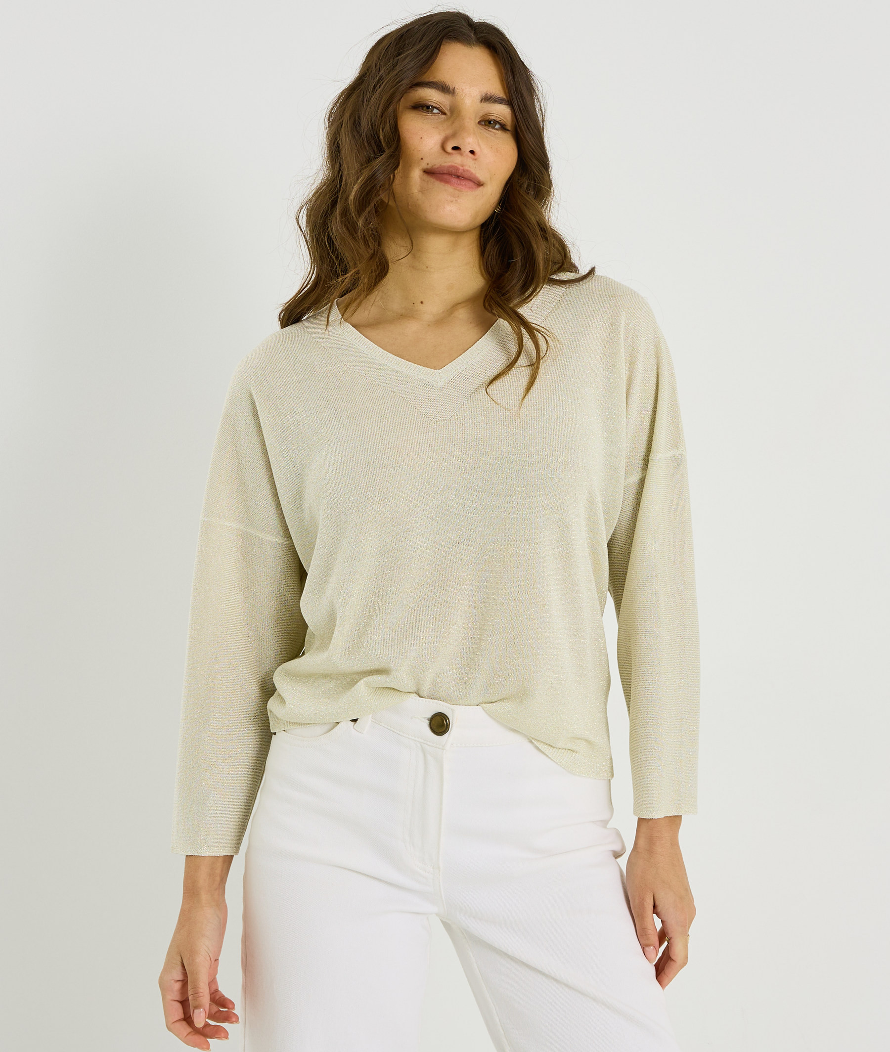 Ce pull à col V se distingue par son fil brillant qui apporte une touche lumineuse à vos tenues. Sa maille et sa coupe confortable en font une pièce agréable à porter.