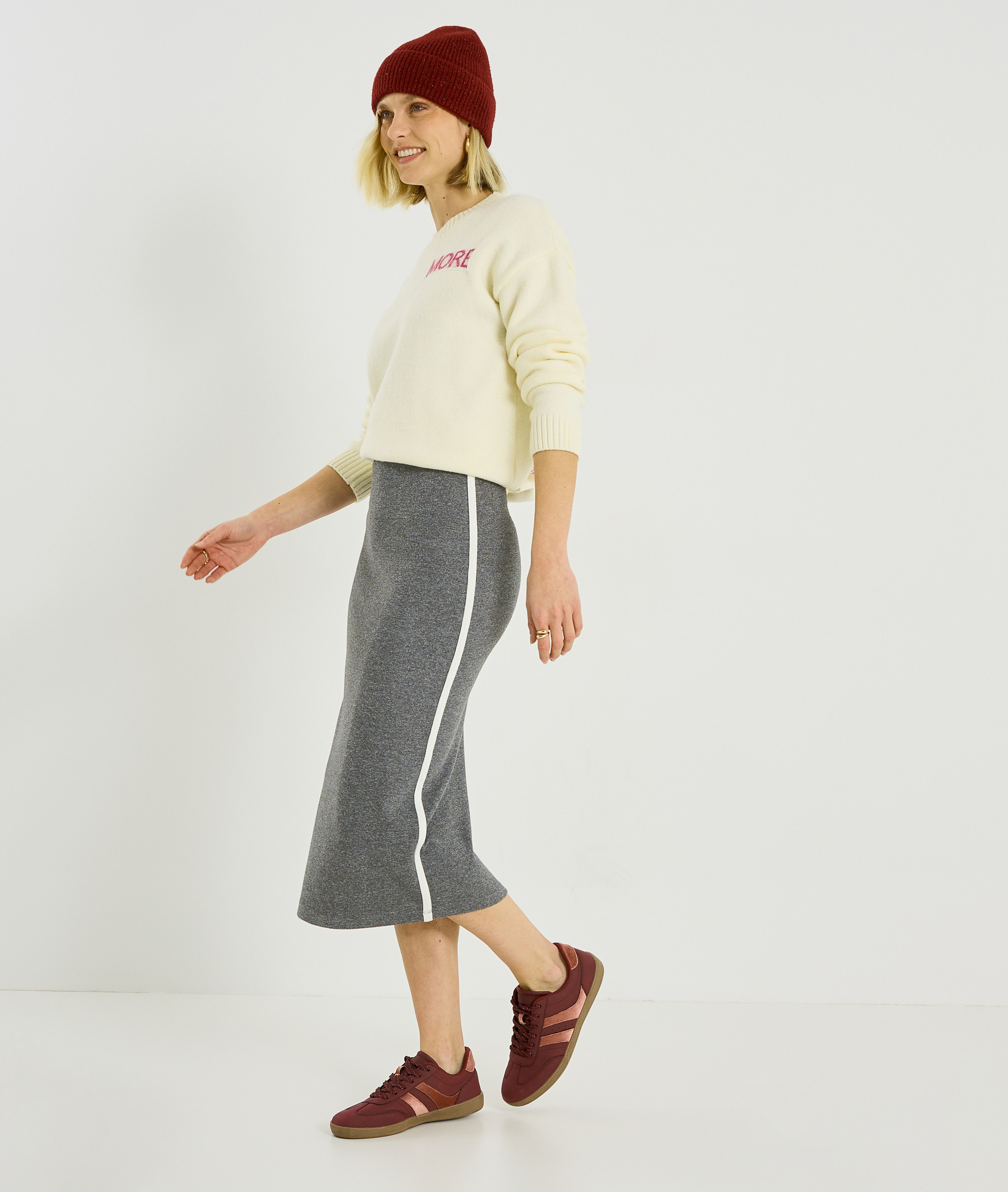 Cette jupe tube mi-longue est la pièce essentielle pour un look à la fois sophistiqué et urbain. Elle épouse délicatement la silhouette tout en garantissant un confort optimal et une liberté de mouvement.
