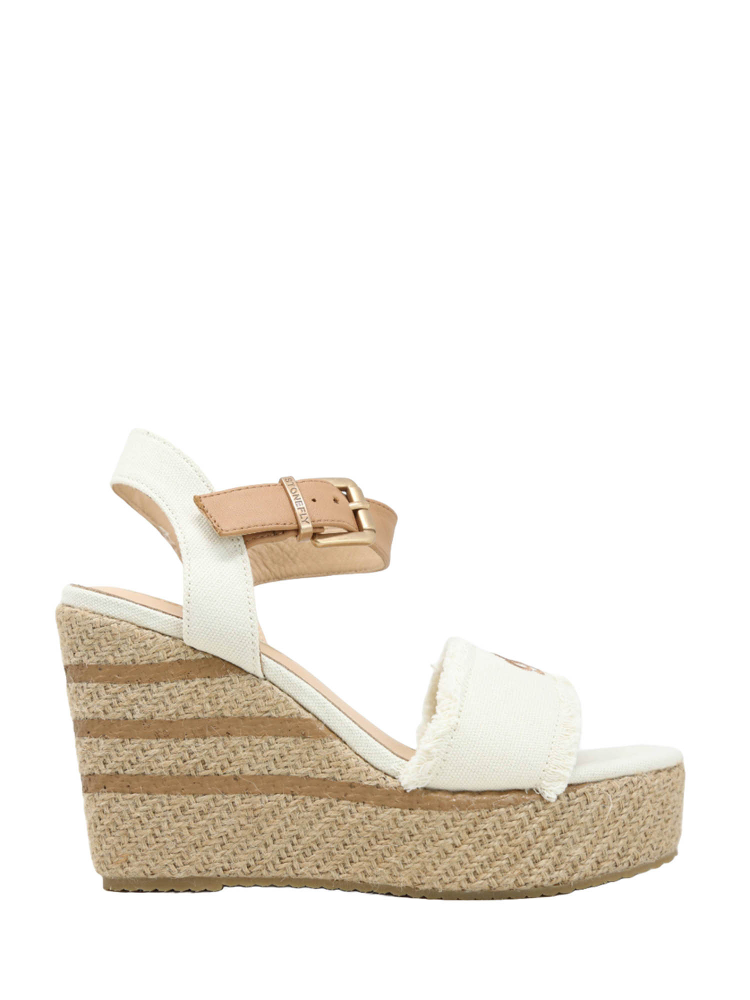 Description : Sandale compensée pour femme en tissu blanc avec coupe régulière.