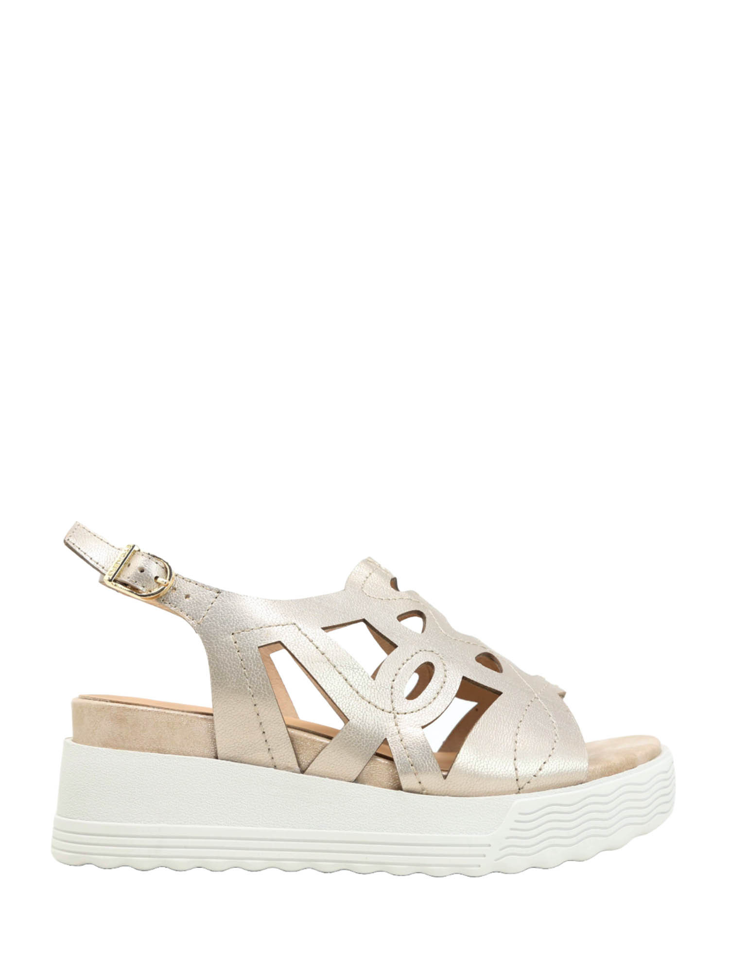 Description : Sandale compensée pour femme en cuir laminé avec coupe régulière.