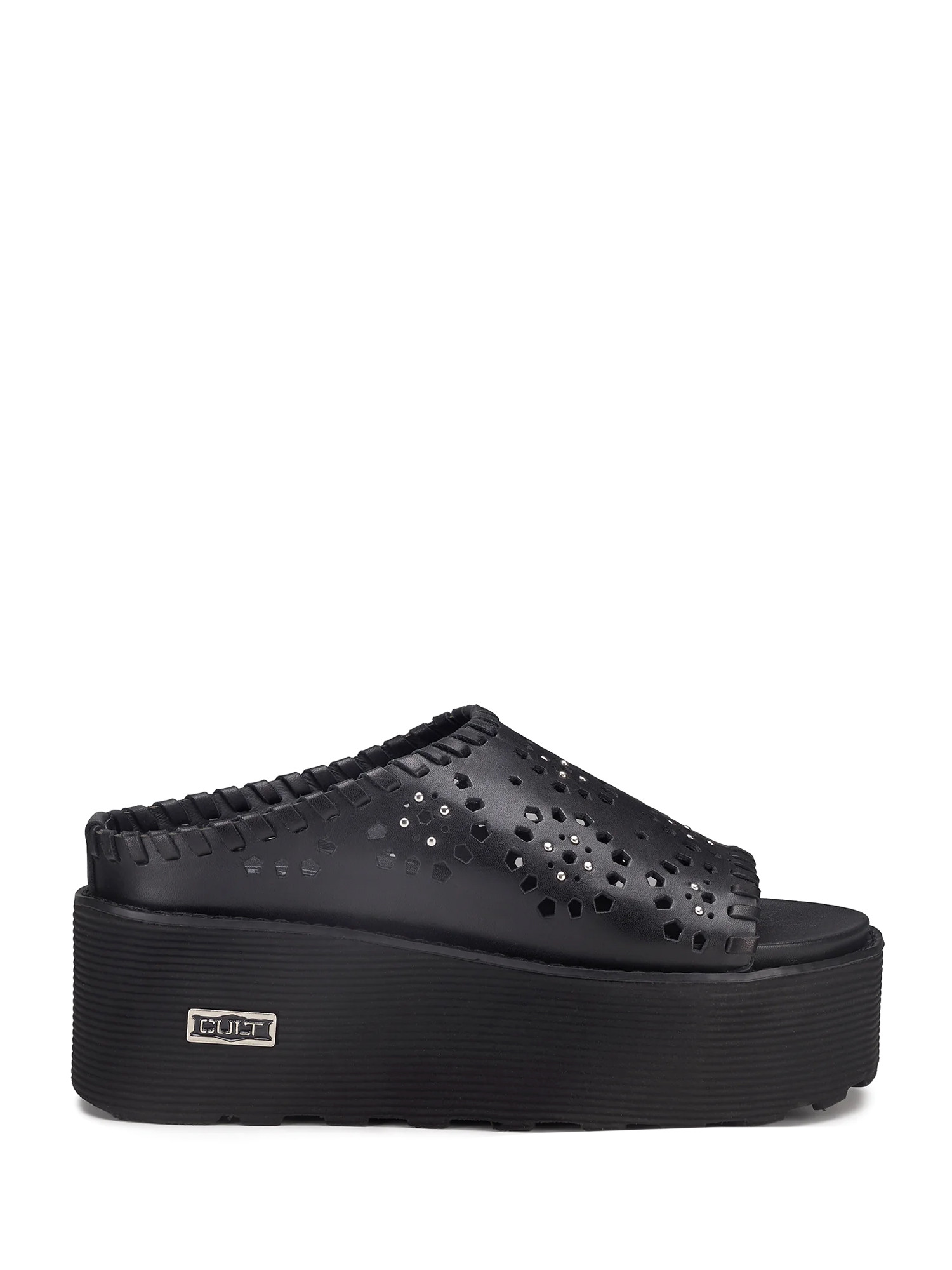 Description : véritable incontournable de la saison, ces sandales signées CULT reposent sur une semelle plateforme et sont sécurisées par une maxi bande en cuir noir perforé à motifs floraux et mini clous métalliques.