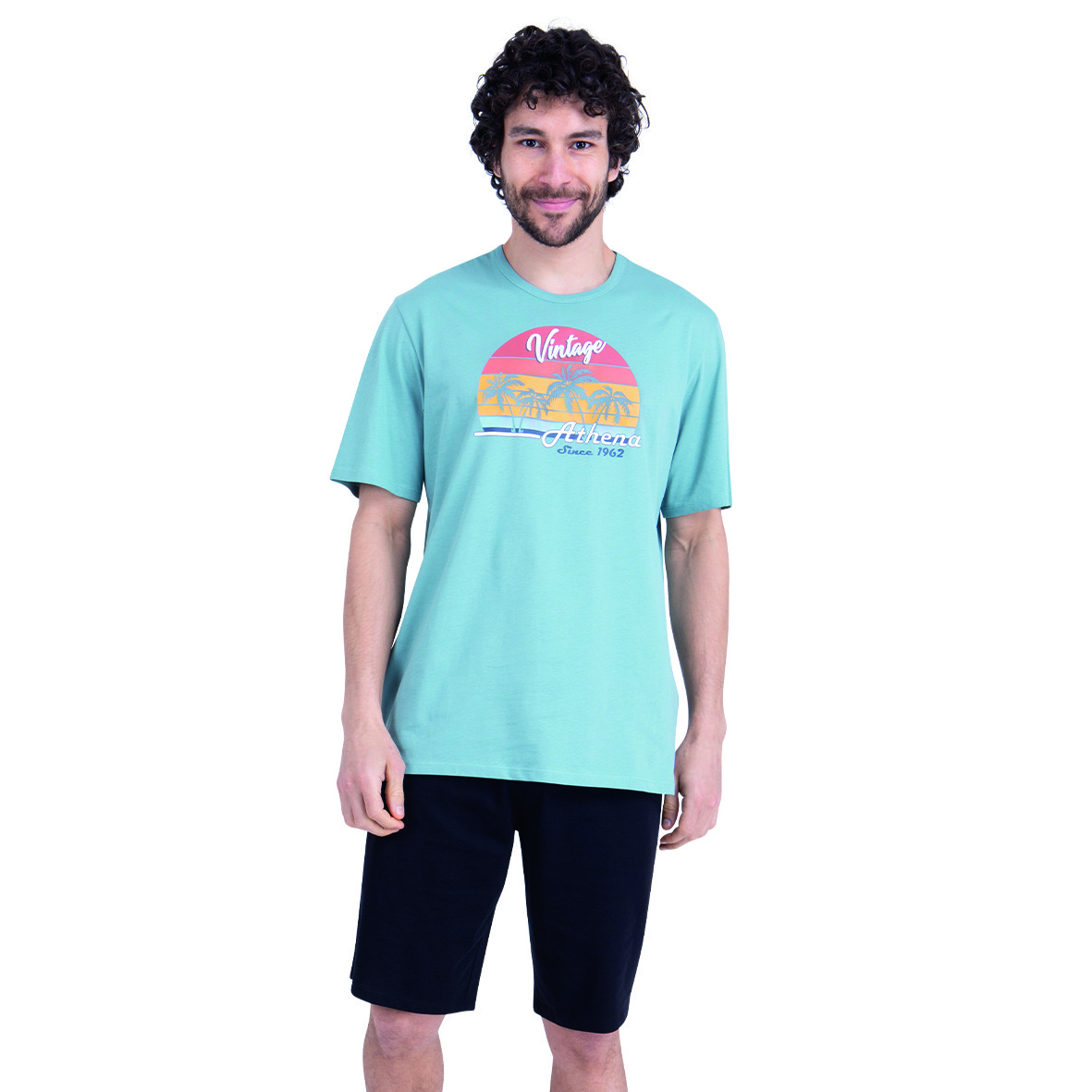 Caractéristiques Pyjama court ECOPACK SERIGRAPHIE, Jersey 100% coton respirant pour évacuer la transpiration, Haut à manches courtes bleu minéral sérigraphié, Short noir uni, Coupe simple et confortable, Collection Ecopack – pratique et accessible, Vendu à l’unité : haut + bas coordonnés, Label OEKO-TEX® Standard 100 : garantit l’absence de substances nocives dans des quantités pouvant nuire à la santé, Pyjama court col rond