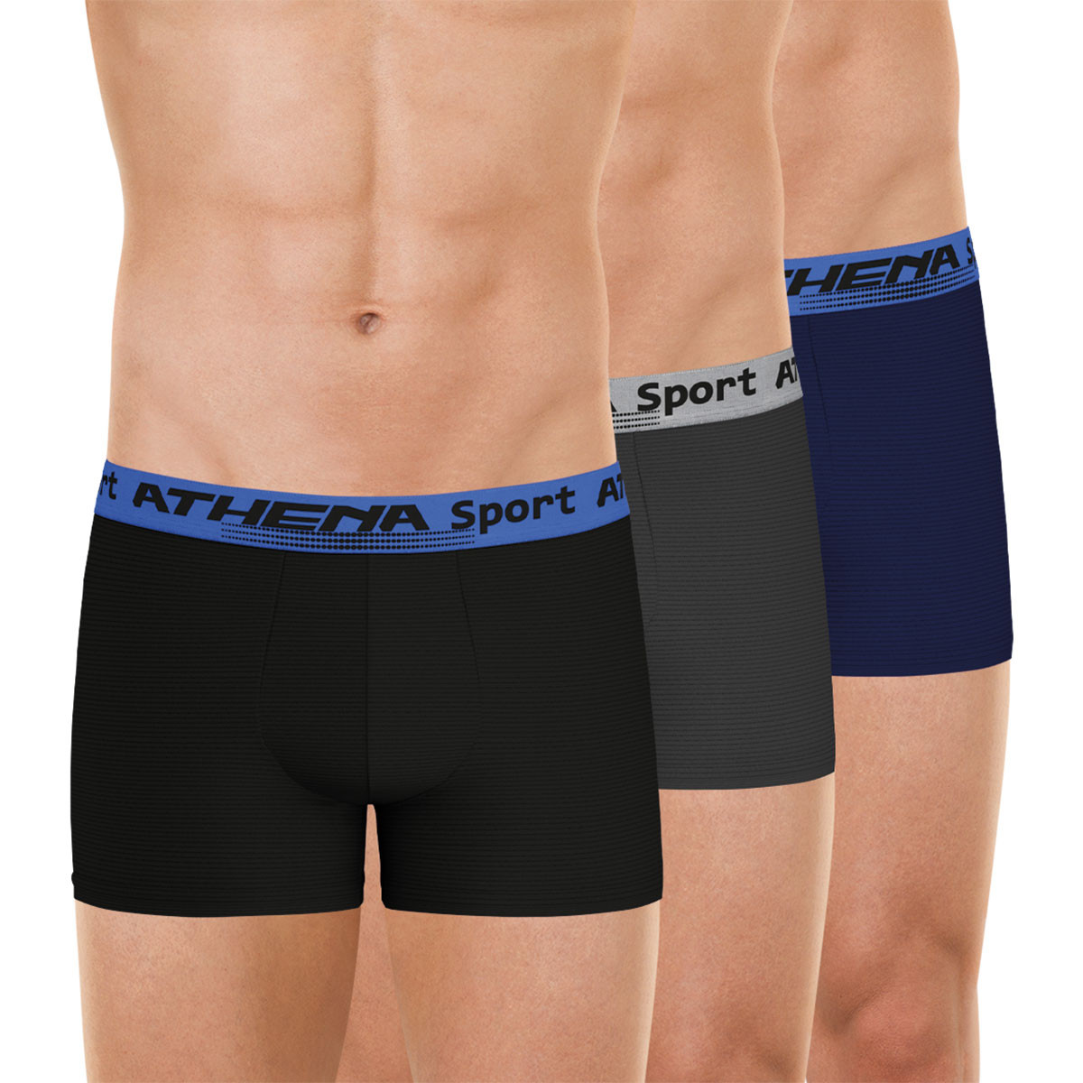 Caractéristiques de ce lot de 3 boxers DAILY SPORT AIR ATHENA, Microfibre respirante, Matière mesh aérée, Coupe boxer moderne : doublé devant et avec un empiècement fond pour plus de confort, Ceinture avec écritures ATHENA SPORT, Ceinture large 33mm au look sportswear douce et confortable, Idéal pour le quotidien comme pour le sport, Composition : 85% Polyester 15% Elasthanne, Grandes tailles disponibles : existe jusqu'en taille 7, Label OEKO-TEX® standard 100 : garantit l'absence de substances nocives dans des quantités pouvant nuire à la santé, Sans étiquette, ne gêne pas, ne gratte pas, Si vous êtes entre deux tailles : nous vous conseillons une taille au-dessus, Prenez soin de votre linge et consommez moins d'énergie : Lavez à basse température (30) et privilégiez le séchage naturel