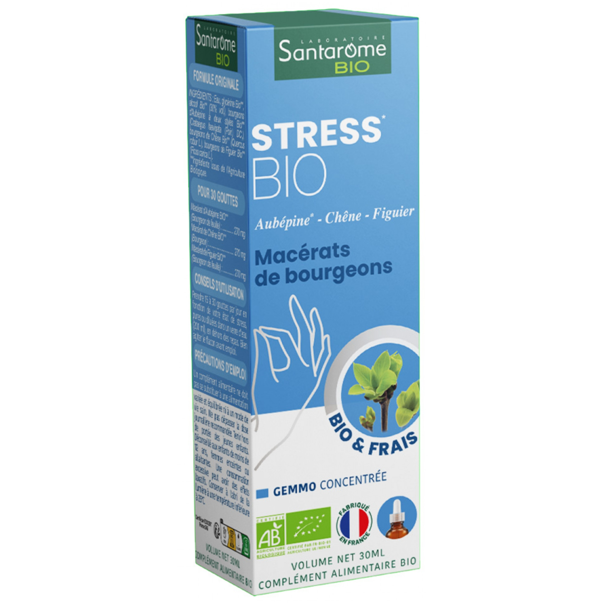 Santarome Bio Stress Macérats de Bourgeons Bio 30 ml est un complément alimentaire à base de macérats de bourgeons d'aubépine, chêne et figuierL'aubépine réduit la nervosité et diminue les tensions nerveuses Certifié Agriculture Biologique, Contrôle FR-BIO-01 Fabriqué en France