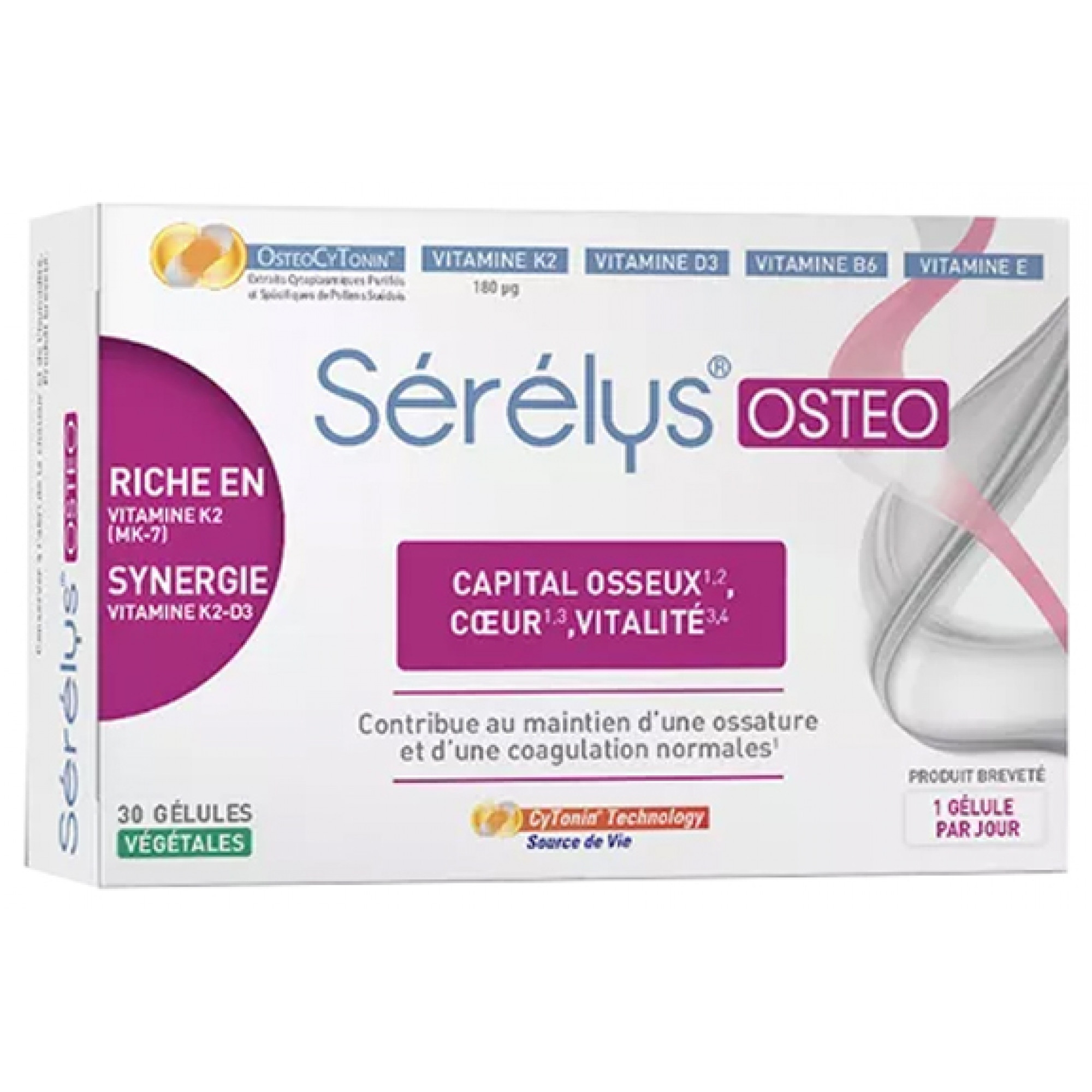Sérélys OSTEO est une association de 2 complexes OsteoCyTonin® et de 4 types de vitamines : 1. La vitamine k (présente sous forme de vitamine K2) contribue au maintien d'une ossature et d'une coagulation sanguine normales. 2. La vitamine d (présente sous forme de vitamine D3) contribue à l'absorption et à l'utilisation normale du calcium. Contribue au maintien d'une ossature normale. 3. La vitamine B6 contribue au métabolisme normal de l'homocystéine et à réduire la fatigue. 4. Les extraits de pollens (OsteoCyTonin® Complex pi & GC) contribuent à la résistance du corps et favorisent la vitalité - extraits cytoplasmiques purifiés et spécifiques de pollens - sans activité phytoestrogénique - contiennent de nombreux nutriments - hautement biodisponibles. 5. La vitamine e protège les cellules contre le stress oxydatif.