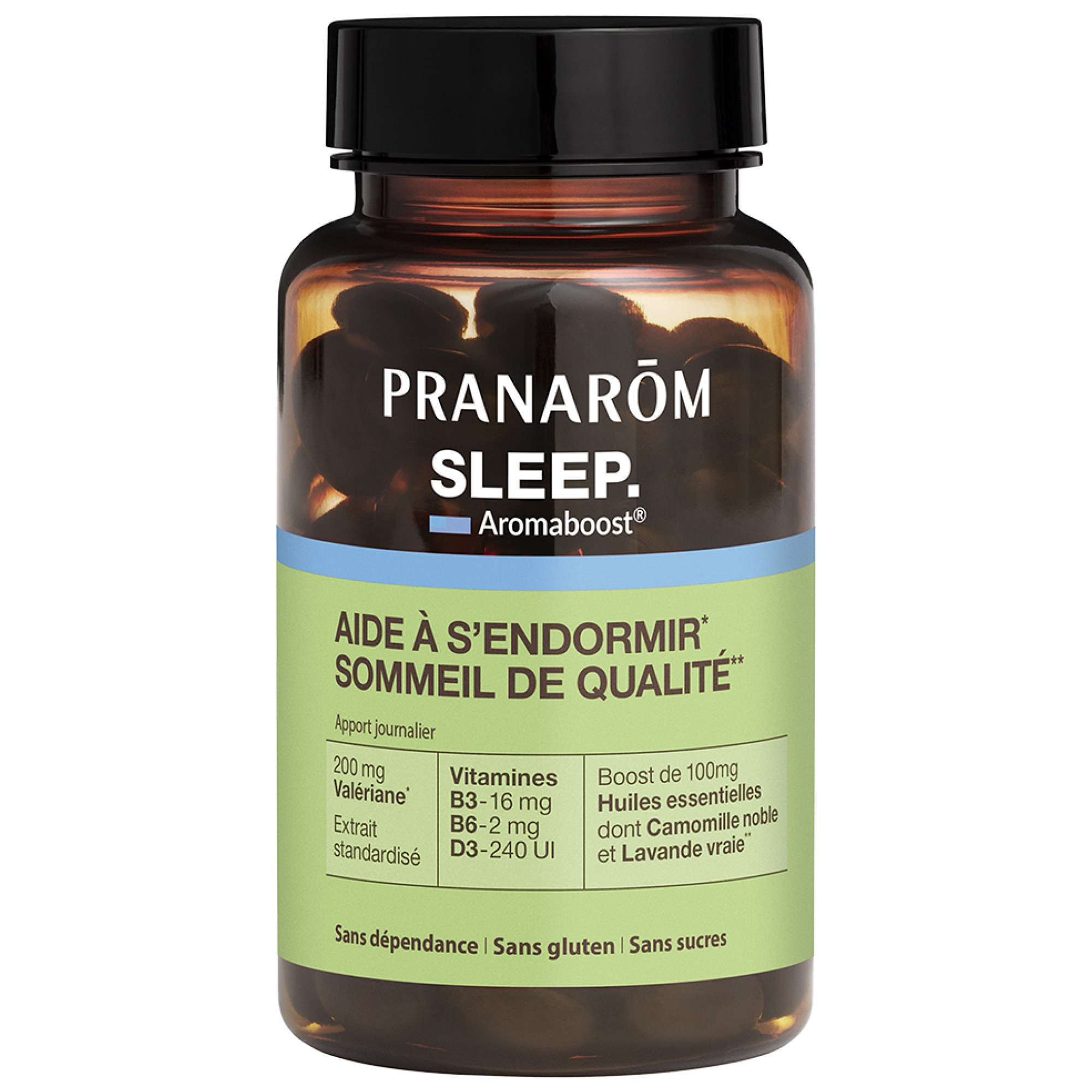 Favorise un sommeil sain : conçu pour retrouver rapidement un sommeil serein et réparateur, Aromaboost SLEEP offre un soutien durable durant les périodes où le sommeil est perturbé. Cette innovation combine des extraits de plantes et des vitamines, enrichie par les huiles essentielles 100% naturelles, pures et intégrales du laboratoire Pranarôm. Efficacité prouvée : les capsules Aromaboost SLEEP ont démontré leur capacité à réduire le temps d'endormissement et diminuer les réveils nocturnes chez près de 9 personnes sur 10 (test consommateur réalisé par un institut indépendant sur 50 personnes pendant 30 jours). Une synergie unique : Aromaboost SLEEP est formulé avec un mélange exclusif d'extraits de plantes incluant la valériane, des vitamines B3, B6, D3, et boostées par les huiles essentielles pures et intégrales de camomille noble, lavande vraie et d'essence de mandarinier, créant une synergie puissante pour soutenir la relaxation et maintenir un sommeil optimal. Une formulation saine : Aromaboost SLEEP présente une composition à 99,1% d'ingrédients d'origine naturelle, sans sucre et sans gluten. Ce complément de santé n'entraîne aucun risque d'accoutumance ni d'effets secondaires.